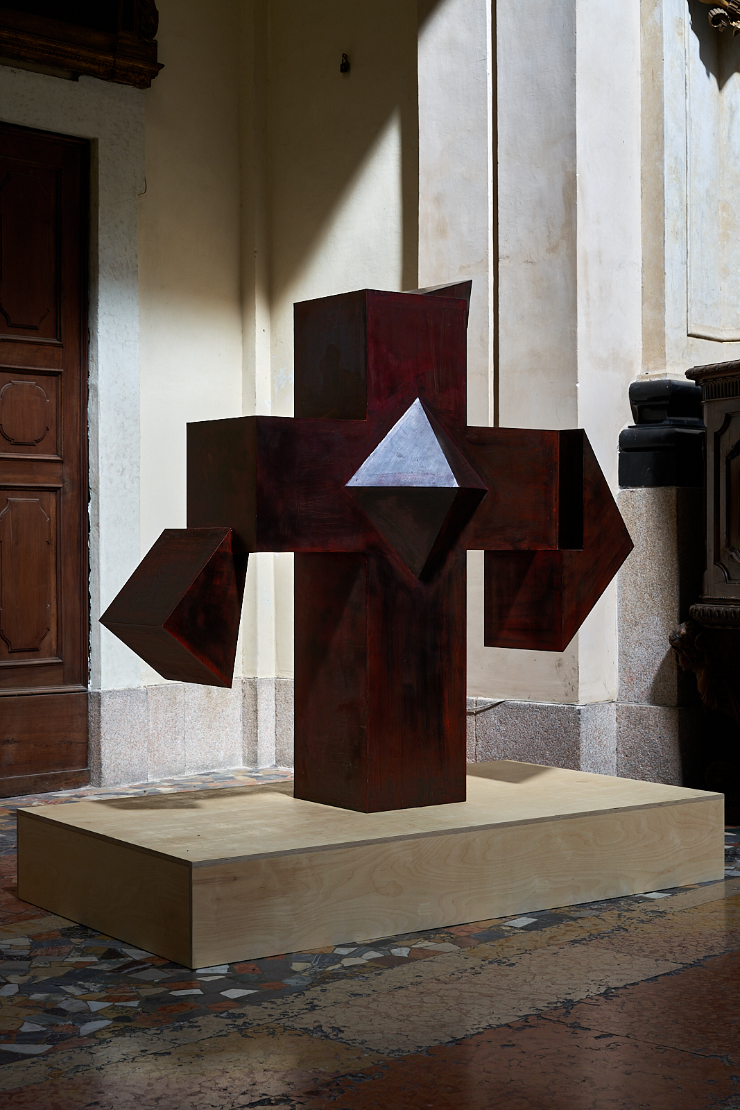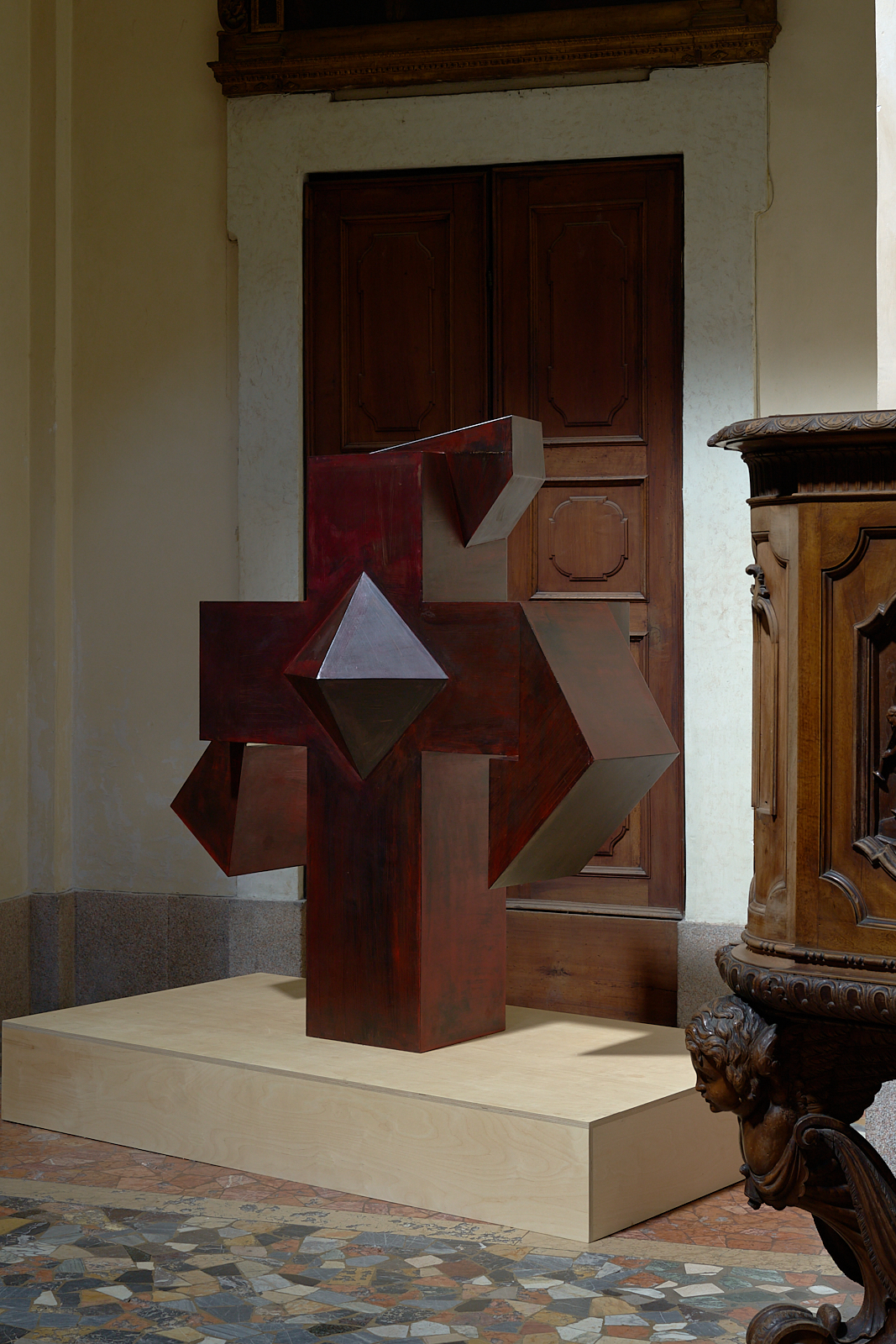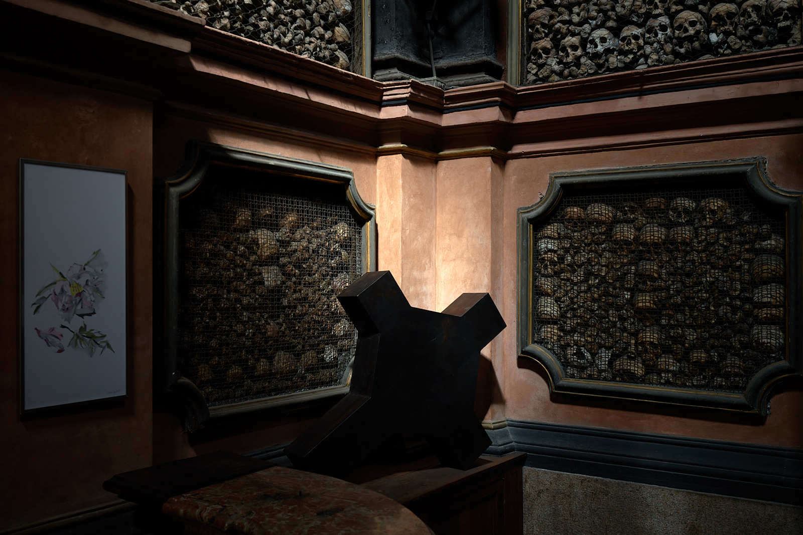 La mostra si sviluppa partendo dalla chiesa dove sono presenti una grande croce in ferro e un dittico, continua nell’ossario dove le opere, ospiti discreti, dialogano con gli arredi esistenti. Nella cappella dell’ossario poi si alternano una serie di disegni realizzati per questa mostra.