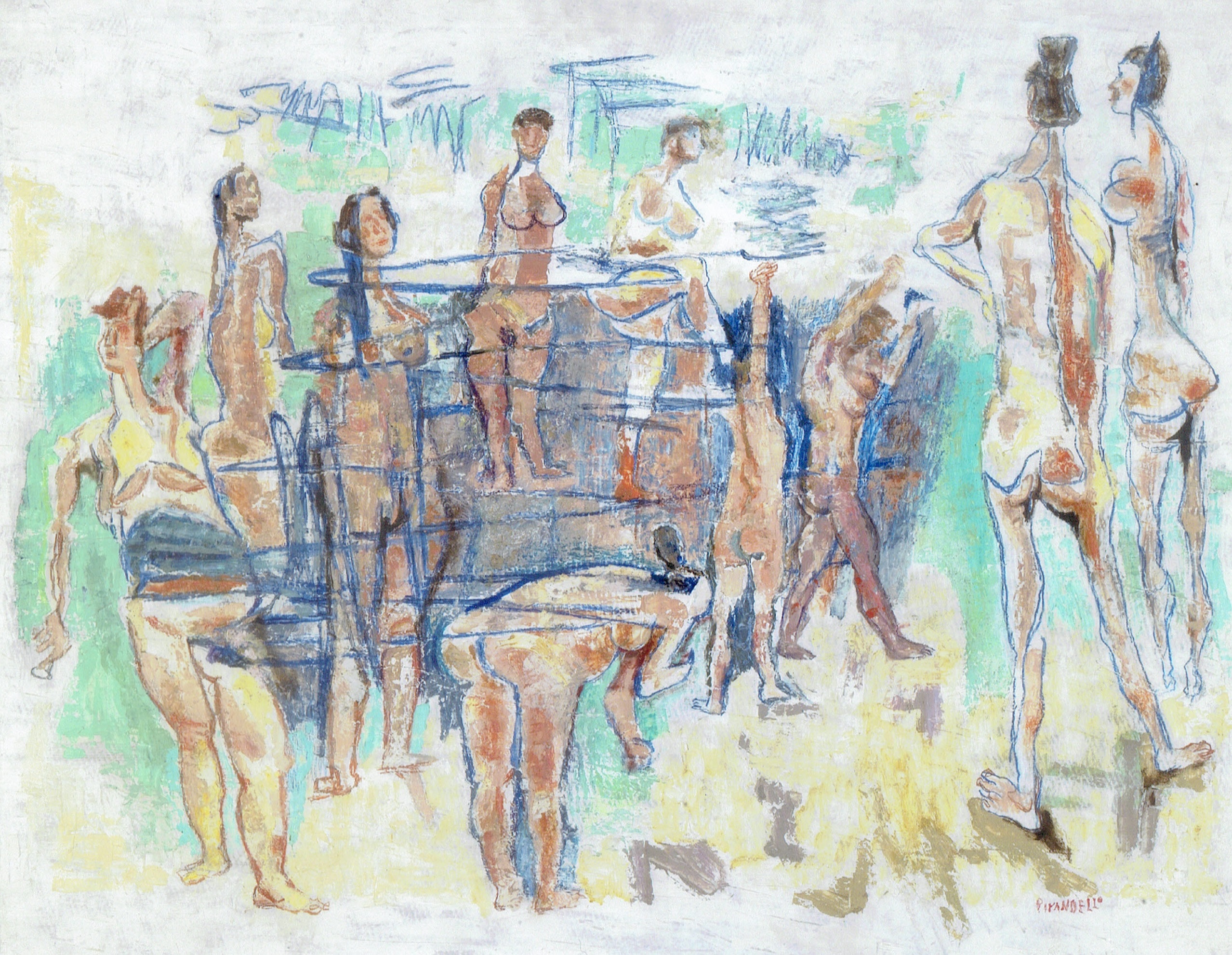 Il soggetto delle bagnanti è un riferimento storico che, pur evocando Cézanne, si aggiorna ad un linguaggio sempre nuovo, tanto che, in virtù di questa capacità di rinnovamento costante,Nello Ponente, allievo di Venturi e promotore di artisti contemporanei di rottura,definisce Pirandello un pittore d’avanguardia , pieno di contrasti, in grado di rompere con il suo modo precedente, uscendo fuori ogni volta con qualcosa di nuovo e di bello; prudente ma audace, secondo Ponente, egli è un artista che raggiunge lentamente risultati rivoluzionari e che possiede una libertà formale adatta ad esprimere quel mondo complesso che ci riguarda.