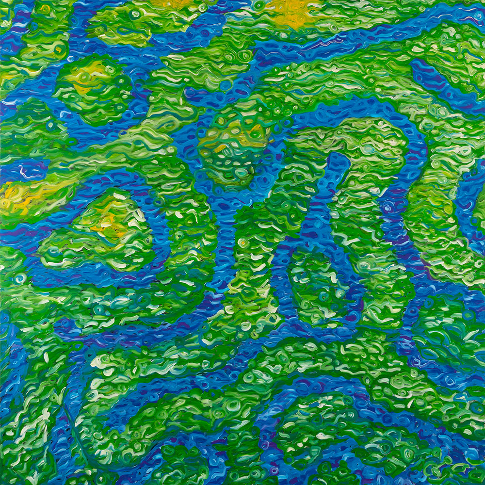 I dipinti di grande formato nascono da un’indagine sulle creature marine che popolano i corsi d’acqua come il Phlyctenanthus australis, l’Holacanthus ciliaris, il Tridacna crocea e l’Octopus briareus. Colori acrilici assoluti, segni vivi in movimento, popolano le tele dell’artista e trascinano il visitatore dentro l’elemento fluido: l’acqua come sorgente di vita, elemento salvifico, bisogno indispensabile e primario. I materici quadri di piccolo formato appaiono, invece, come preziosi reperti affiorati dal mare, le sculture realizzate con lamine di ferro e legno, prendono vita come esperimenti magici, galleggiano nel tempo. Se nella serie delle Idropitture degli anni ‘80, la natura-tela era soggetta agli ondeggiamenti e alle maree del colore, ora l’acqua è simultaneamente mezzo e oggetto celebrato dall’artista, che prosegue il sentiero ininterrotto tra la sua arte e il suo vivere, tra la sua espressione e le sue radici antropologiche e culturali. […]