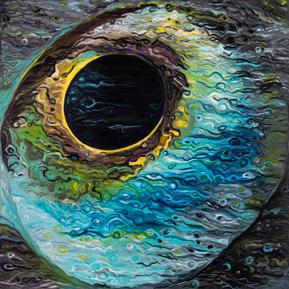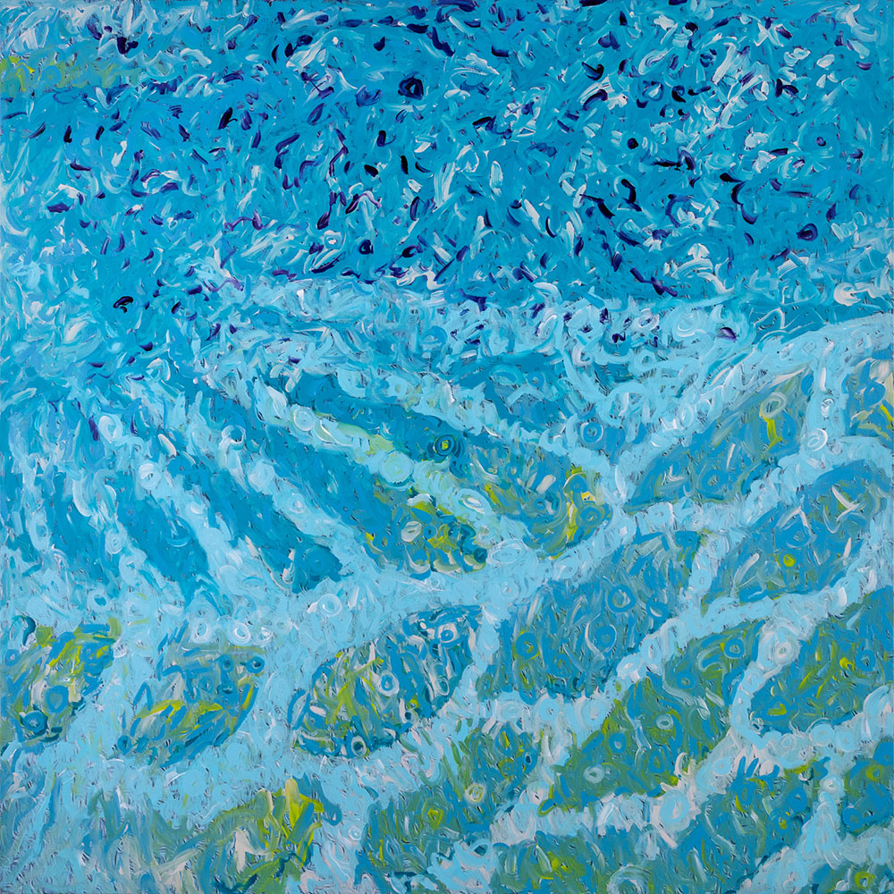 - Scrive Virginia Miele (curatrice della mostra) - […] L’azzurro è l’unico colore in possesso della totalità delle dimensioni spaziali, gli appartengono la profondità del fondale del mare, sempre più cupo proseguendo nell’immersione, l’altezza dello splendore della volta celeste e la distanza, che definisce il limite del nostro orizzonte. Se l’altezza e la distanza sono le dimensioni abitate dall’artista, nel viaggio che ha condotto il suo sguardo nello spazio, approdando poi alla realizzazione dei paesaggi terrestri fotografati dal satellite, uniti tutti dal linguaggio dell’anima, ora è la profondità ad essere esplorata nelle sue tele, dando vita a un’allegorica ballata di mondi marini.
