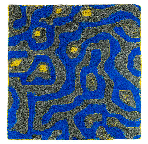 La ballata allegorica degli organismi acquatici permea anche il morbido tappeto realizzato a mano, posato a terra al centro della stanza, una superficie di trame intrecciate dai colori vivaci, che spinge il fruitore ad un approccio cha abbraccia più sensi - l’opera si vede, si tocca, si percorre in un rapporto mediato dalla sua natura di oggetto decorativo, di suolo sacro e di manufatto in grado di farci volare con la mente.