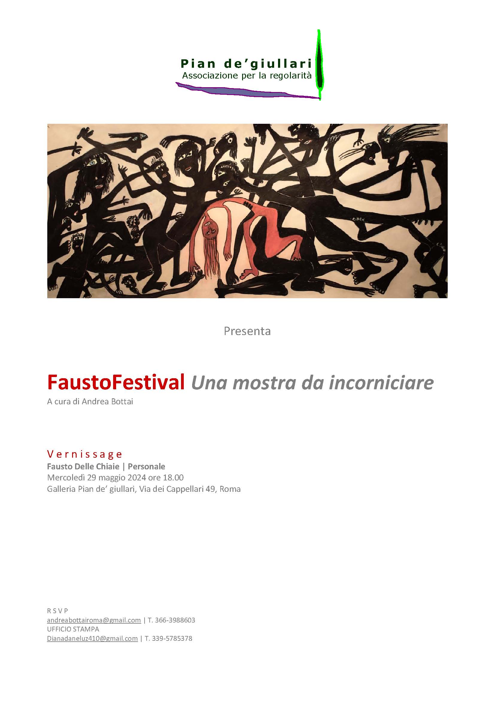 VERNISSAGE “FaustoFestival. Una mostra da incorniciare” – Mercoledì 29 maggio 2024 ore 18.00 – Pian dé giullari, Via dei Cappellari 49. Ingresso libero. Accrediti stampa e materiali: T. 339-5785378. La mostra resterà visitabile su appuntamento fino al 30 settembre 2024.