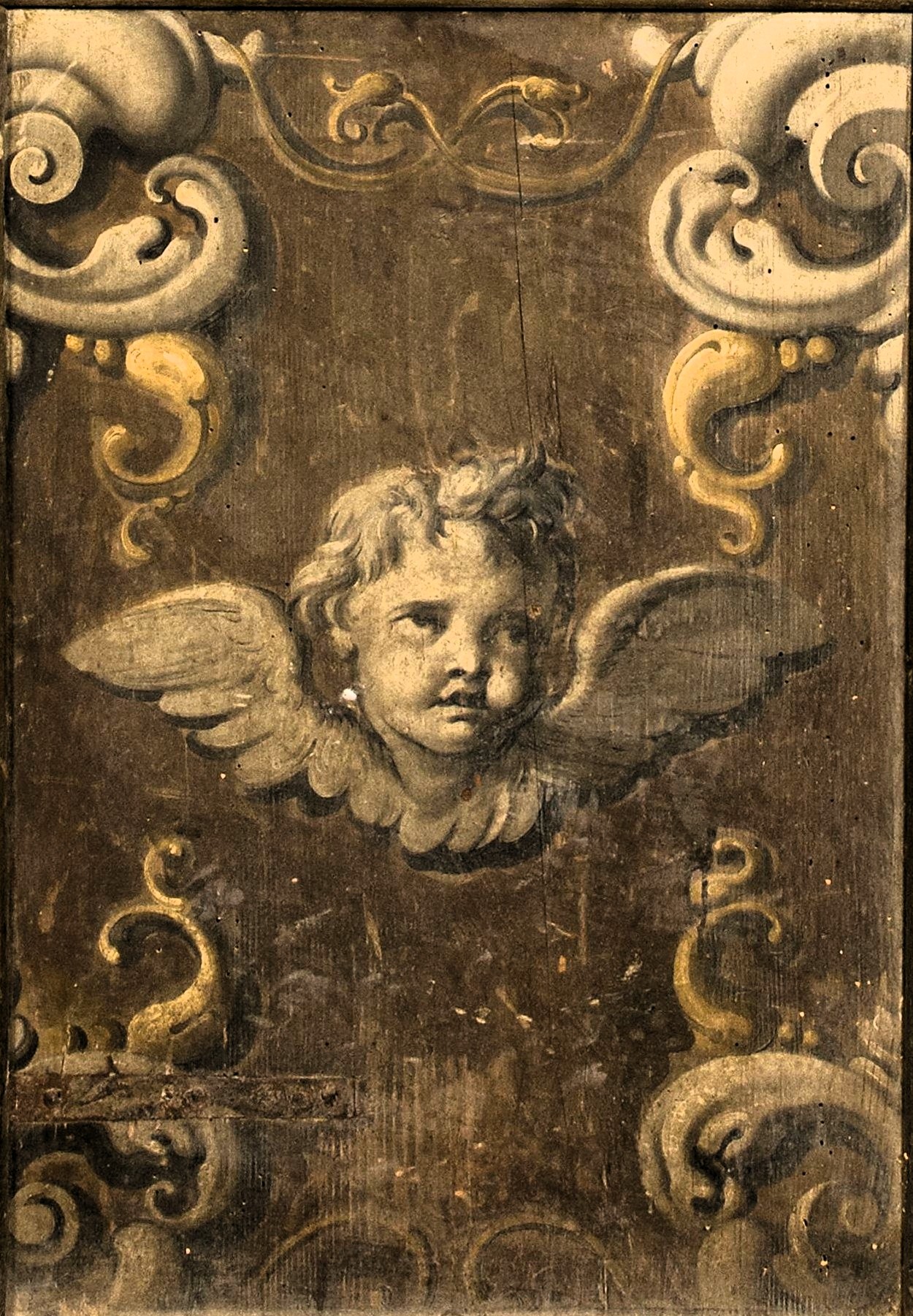 Dentro tre riserve circolari, tra raffinati decori vegetali a grisaglia, troviamo dipinte a monocromo altrettante virtù (tre teologali e una cardinale): Speranza, Carità e Giustizia; la Fede, invece, è aggiunta ottocentesca. Completa la decorazione ad olio un grande capo alato d’angelo risolto sempre en grisaille, di raffinata qualità esecutiva. La scheda inventariale riporta quale autore della decorazione il pittore imolese Giuseppe Righini. Pietro Antonio Meloni (nelle sue “Memorie” del 1834) indica in Righini l’autore dei “puttini” della decorazione parietale della cappella, ma non menziona mai le porte dipinte. Nel “Libro di cassa” per l’anno 1752 della Mensa Vescovile troviamo il nome dell’imolese Giovanni Battista Gabbioni quale autore di numerosi stemmi di Bandi “ad olio e a guazzo” posti in varie parti del palazzo: si potrebbe pensare perciò al Gabbioni per la decorazione delle porte con lo stemma cardinalizio del Bandi.
