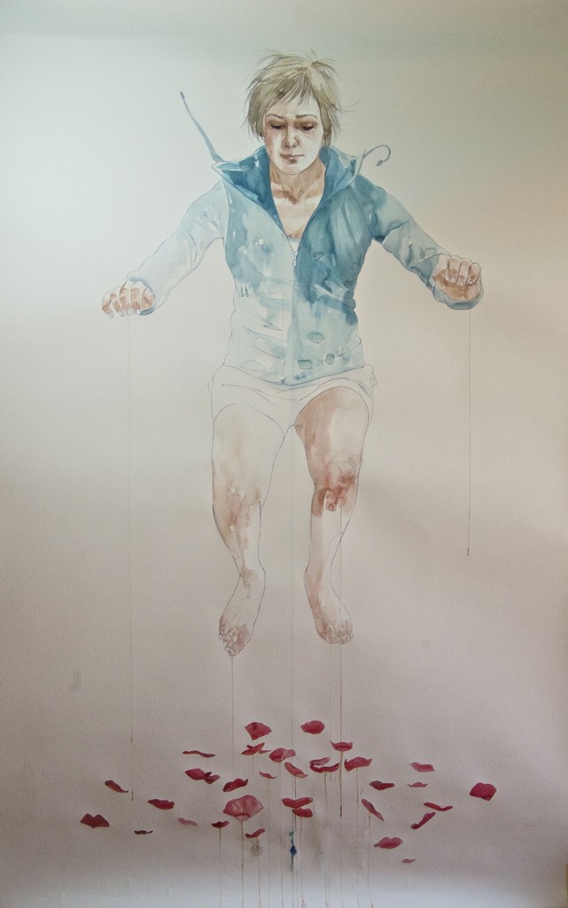Tre installazioni corrisponderanno ad altrettanti acquerelli di grandi dimensioni che ritraggono appunto i saltatori, ossia coloro che rimangono ad affrontare i periodi di dolore che accompagnano inevitabilmente un percorso di separazione, ritratti nel momento in cui la spinta verso l'alto è già avvenuta ed il corpo è tra la sospensione e l'accenno della discesa.