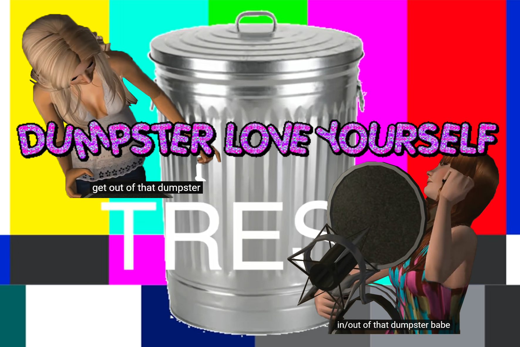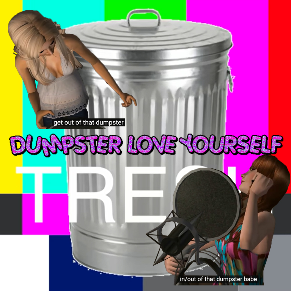 Ricorrendo alla nozione di “scarto” posta dal critico Nicolas Bourriaud, i giovani artisti romani propongono una versione alternativa alla nostra realtà sociale contemporanea imposta, che ne metta in discussione la sua cultura “normalizzante”. Con una cifra stilistica strutturata e riconoscibile, che nell’estetica richiama il video della canzone Dumpster Love Yourself degli youtuber simgmproductions (da cui prende il titolo il progetto), Di Pietrantonio e Frosolini rielaborano ciò che prelevano dai movimenti underweb e da quelle sottoculture a cui si accede prevalentemente online, di cui fanno esperienza diretta. Queste realtà di nicchia, considerate “scarti” dalla cultura dominante (pur subendo un consumo mainstream), vengono tradotte negli spazi di Adiacenze in un unico ambiente concreto attraverso una serie di opere inedite, realizzate in coppia e singolarmente dai due artisti. Se Di Pietrantonio esplora le città del videogioco The Sims in una riflessione su ciò che possa essere ritenuto essenziale in un universo virtuale, Frosolini si concentra sulla costruzione e ri-definizione dell’identità. Infine, i due artisti si confrontano come coppia AFFDP secondo le pratiche del flirt e del salvataggio reciproco.