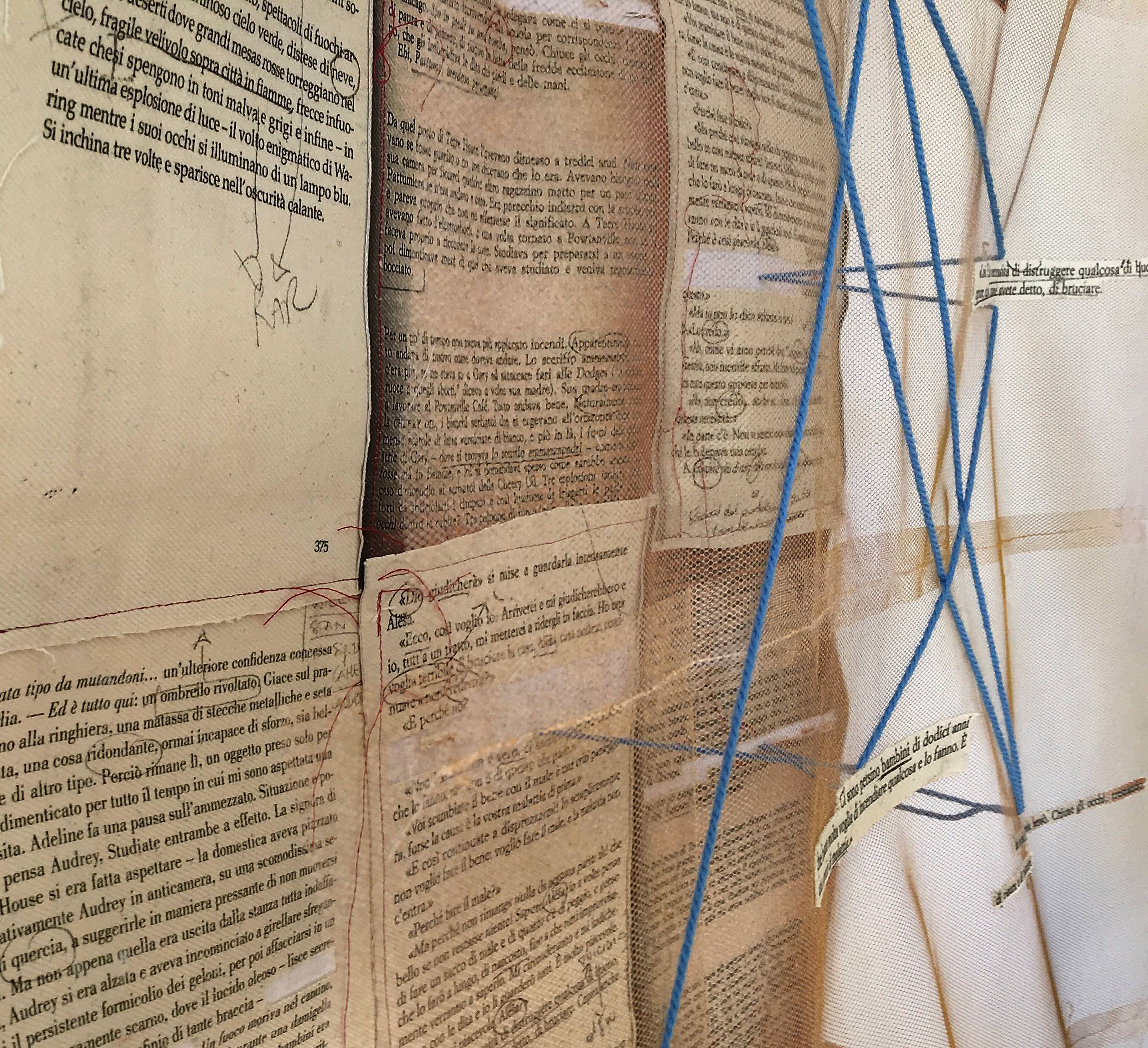 Procedendo a ritroso, dallo strato più superficiale a quello più profondo, il reticolato sospeso della mappa poggia sulle parole chiave usate per ordinare le strade composte di citazioni, che si fanno eco tra loro. Alludono al viaggio. Al movimento. Alla scrittura, che si stacca dal precedente e centrale momento della lettura, che dall’immagine sottostante ha origine e alla quale fa ritorno. Un ritmo circadiano. Una triade che si muove circolare e sovrapposta.