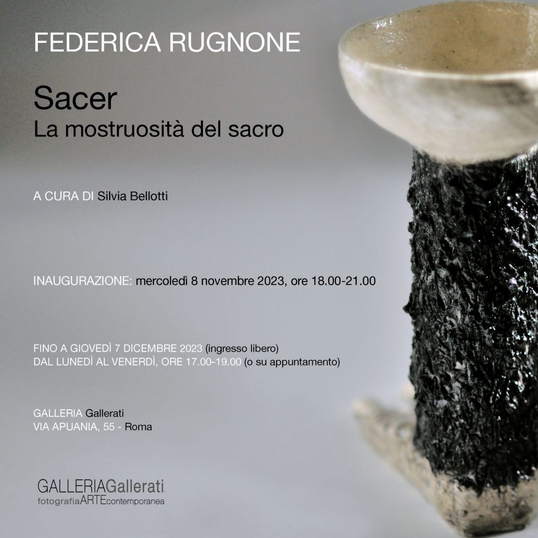 Sacer. La mostruosità del sacro una mostra personale di Federica Rugnone a cura di Silvia Bellotti. La mostra indaga un’idea antica di sacro che decostruisce i moderni dualismi di puro e impuro, divino e demoniaco, sublime e terribile, suggerendo una dimensione relazionale e ibridativa.