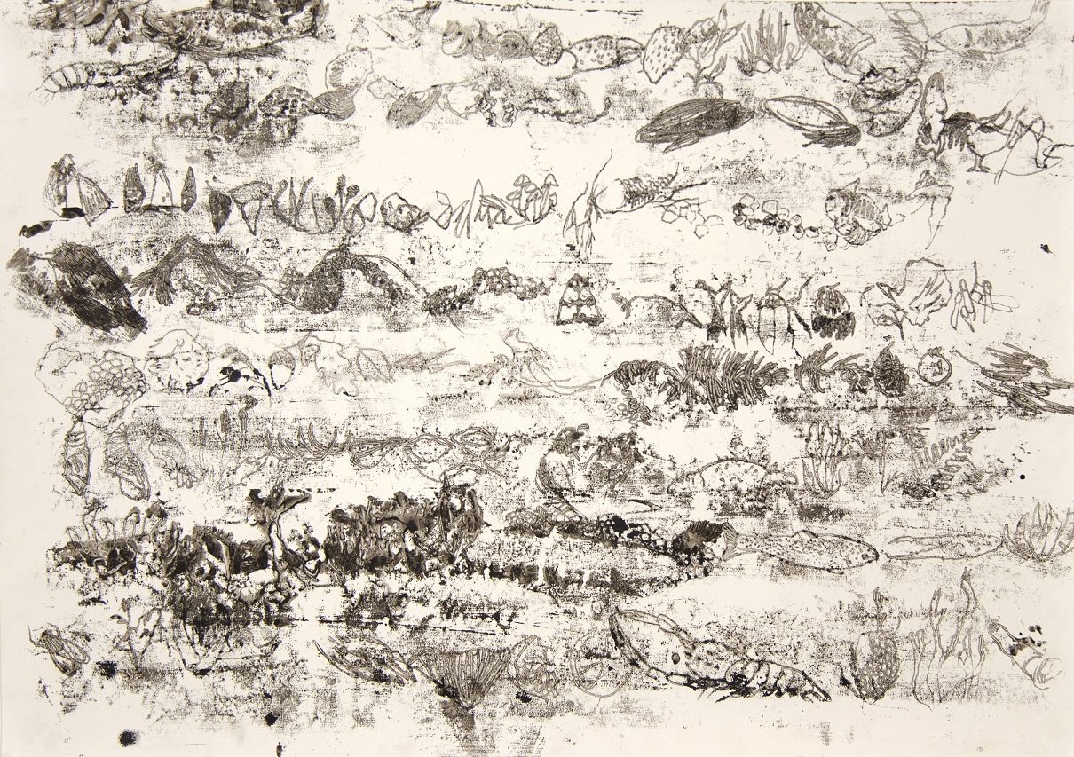 Completano la mostra alcuni lavori su carta dalla serie dei Breviari, sviluppata nel 2020. Come una cassetta entomologica o un erbario, questi brevi segmenti raccolti dal ricordo di molte camminate diventano indizi di paesaggi più ampi. Squame lucenti o rami d’araucaria, la muta di un serpe o la casetta dei molluschi, ruvidi coralli e ossa scolorite si susseguono lungo le trame di una campionatura perpetuamente in itinere.