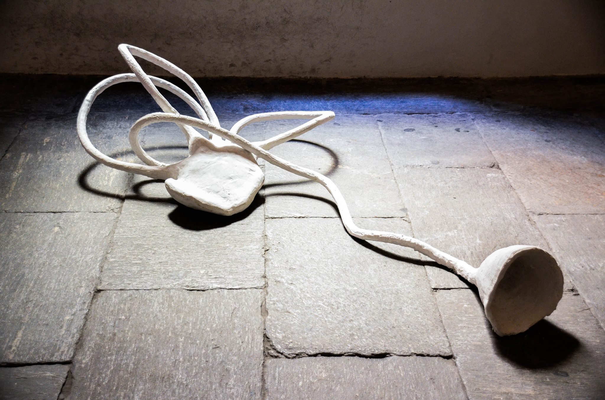 Pezzi fondamentali in mostra, intera chiave di lettura di tutto il percorso di Federica Zianni, le sculture bianche in gesso e corrugato della serie “Labirinti”, stilizzazioni ed estensioni della parte più interna del condotto uditivo. Il labirinto diventa così metafora di messa in ascolto, percezione e disposizione alla ricezione, nel senso sia di segnale acustico sia, più ampiamente, di apertura verso l’altro e verso la conoscenza in generale.
