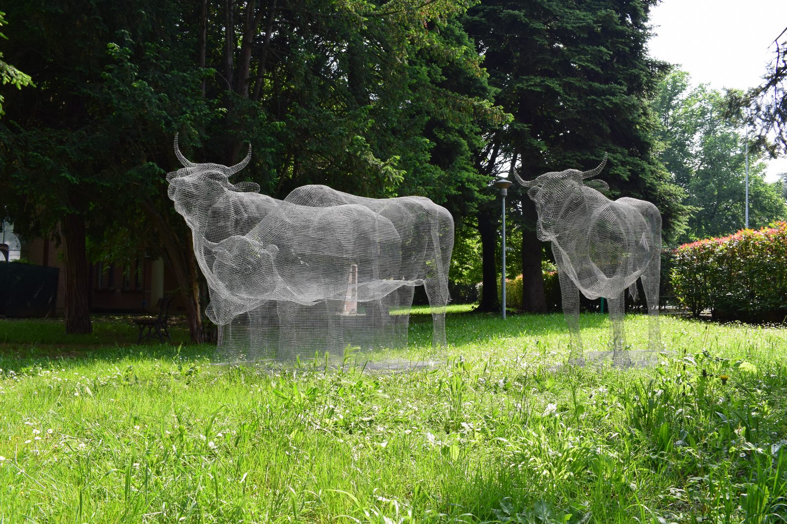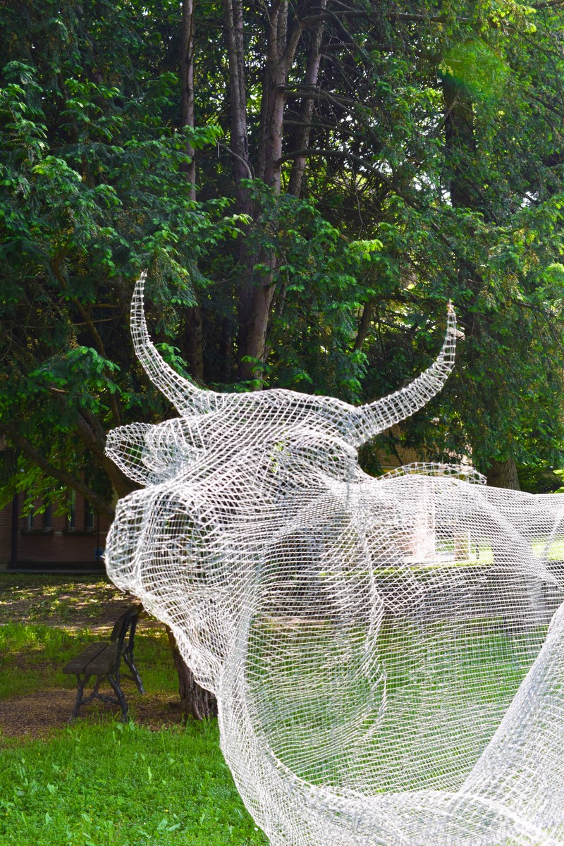 Il rimando tra materiale e concettuale, tra l’estremamente concreto e l’incorporeo è ripreso anche nell’installazione di Michele Liparesi dal titolo “Bestiary - Vacche”, posizionata nel parco. I corpi di tre bovini a grandezza naturale suggeriscono una ruspante fisicità, subito smentita dalla materia con cui sono realizzati, ovvero una fine rete metallica attraversata dall’aria e dalla luce. Togliendo alla “bestia” la sua dimensione concreta, l’artista porta la visione ad un livello contemplativo. L’immagine codificata dell’animale si sgretola, infatti, per lasciare il posto a spirituali rimandi di sacralità, mentre la luce diventa artefice di una continua danza di apparizioni e sparizioni, che si esplica nel corso dell’intera giornata.