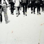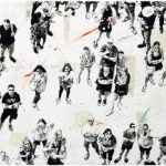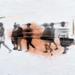 Gli spazi, all’interno delle opere, sono a volte luoghi del tessuto urbano, storici e identificativi, conosciuti, rassicuranti dove le persone stanziano in una comfort zone o si muovono in relazione tra loro, altre volte sono non-luoghi quasi irreali, senza punti identitari o di riferimento, dove le figure lasciano lo spazio all’astrazione, in un’atmosfera liquida, universale, sospesa, onirica, un’apnea di respiro che parla del nostro tempo. In tutte le opere si percepisce un dinamismo forte, composto da elementi discordanti, ma allo stesso tempo in perfetto equilibrio, una spinta che ti porta dentro la tela, alla ricerca di quel posto da occupare con il proprio bagaglio personale, la visione dell’artista che si trasforma in fruizione attiva dello spettatore.