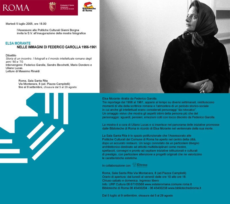 La mostra è a cura di Uliano Lucas e si inserisce nel panorama delle iniziative in ricordo di Elsa Morante nel ventennale della sua morte.