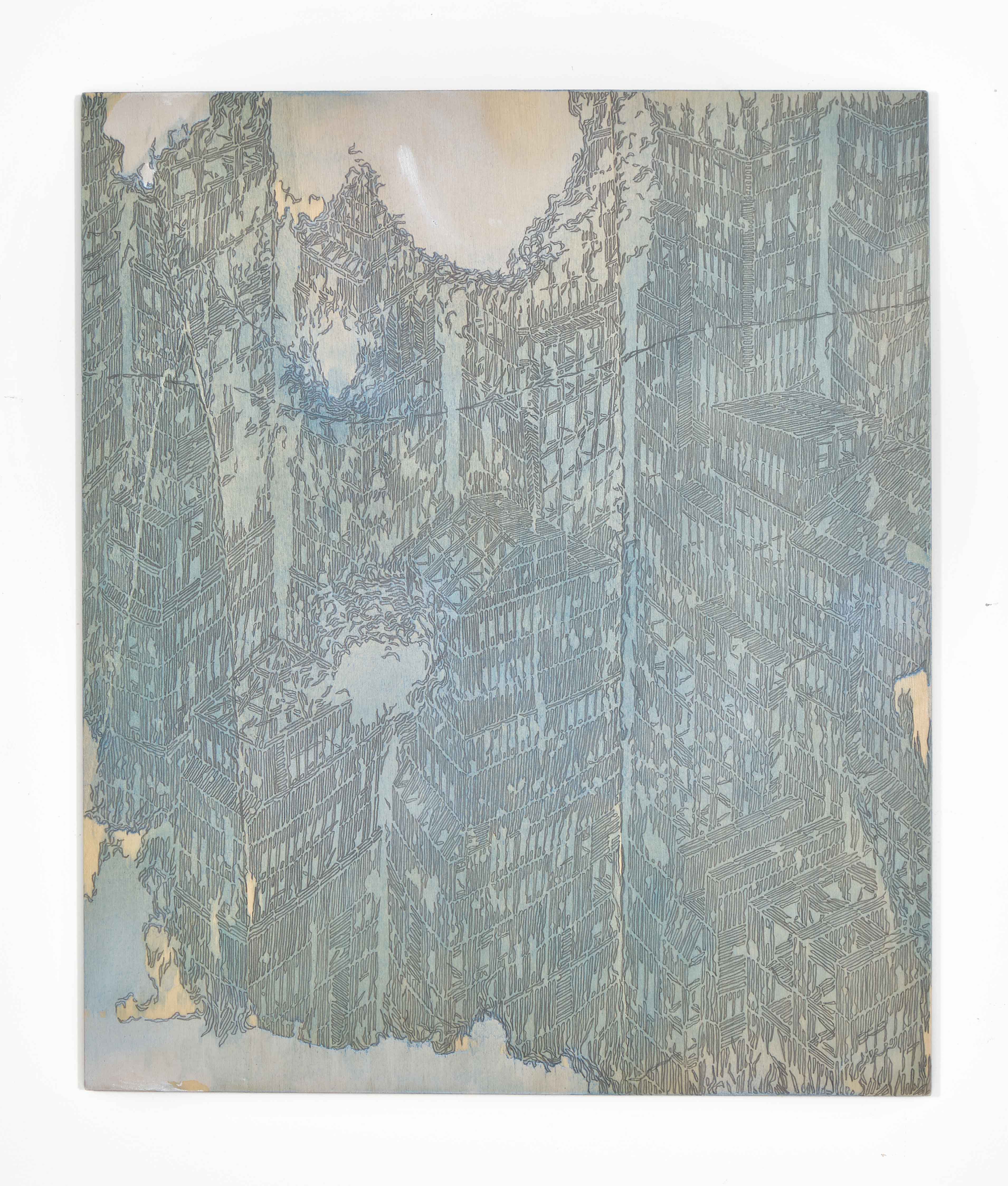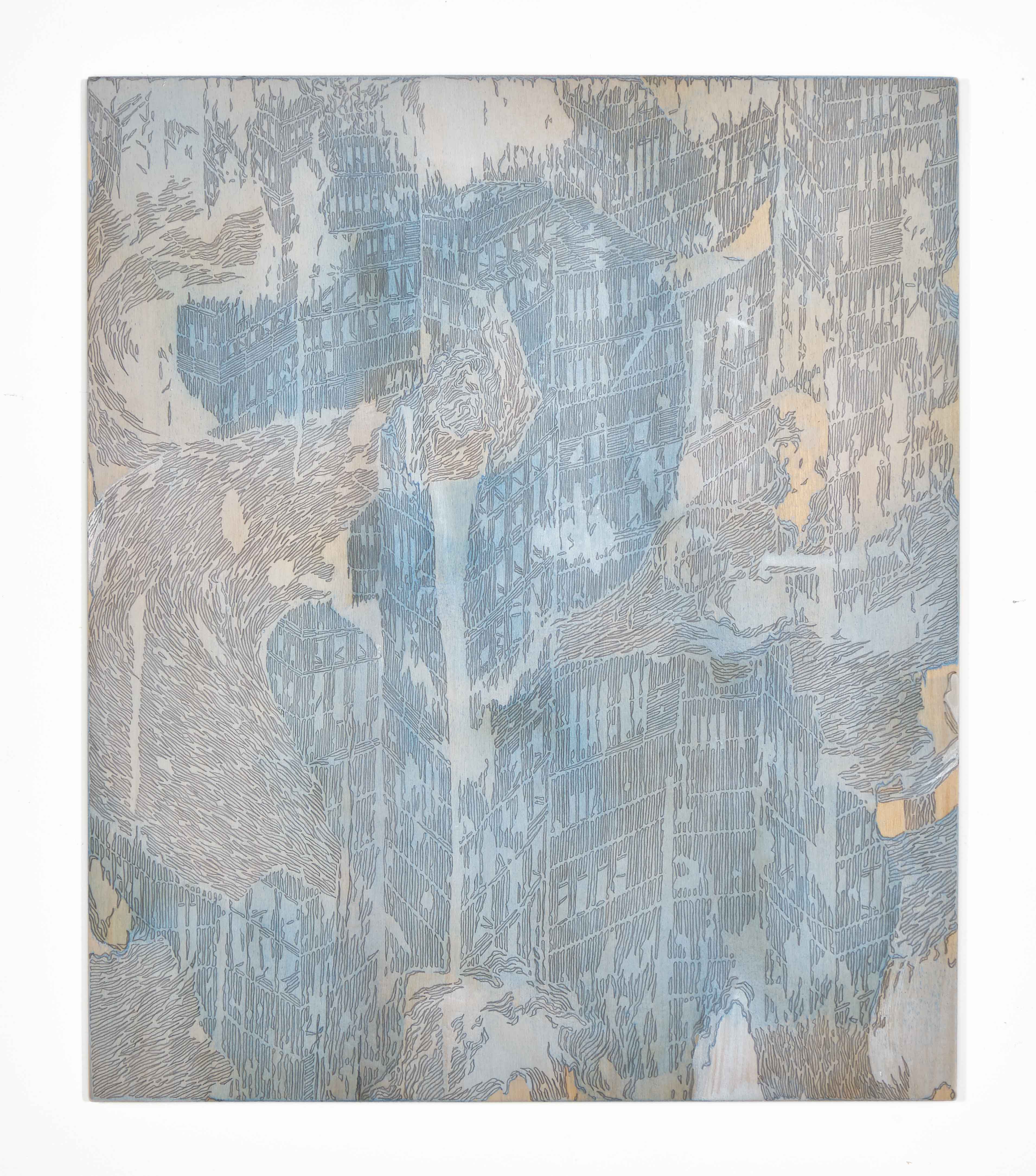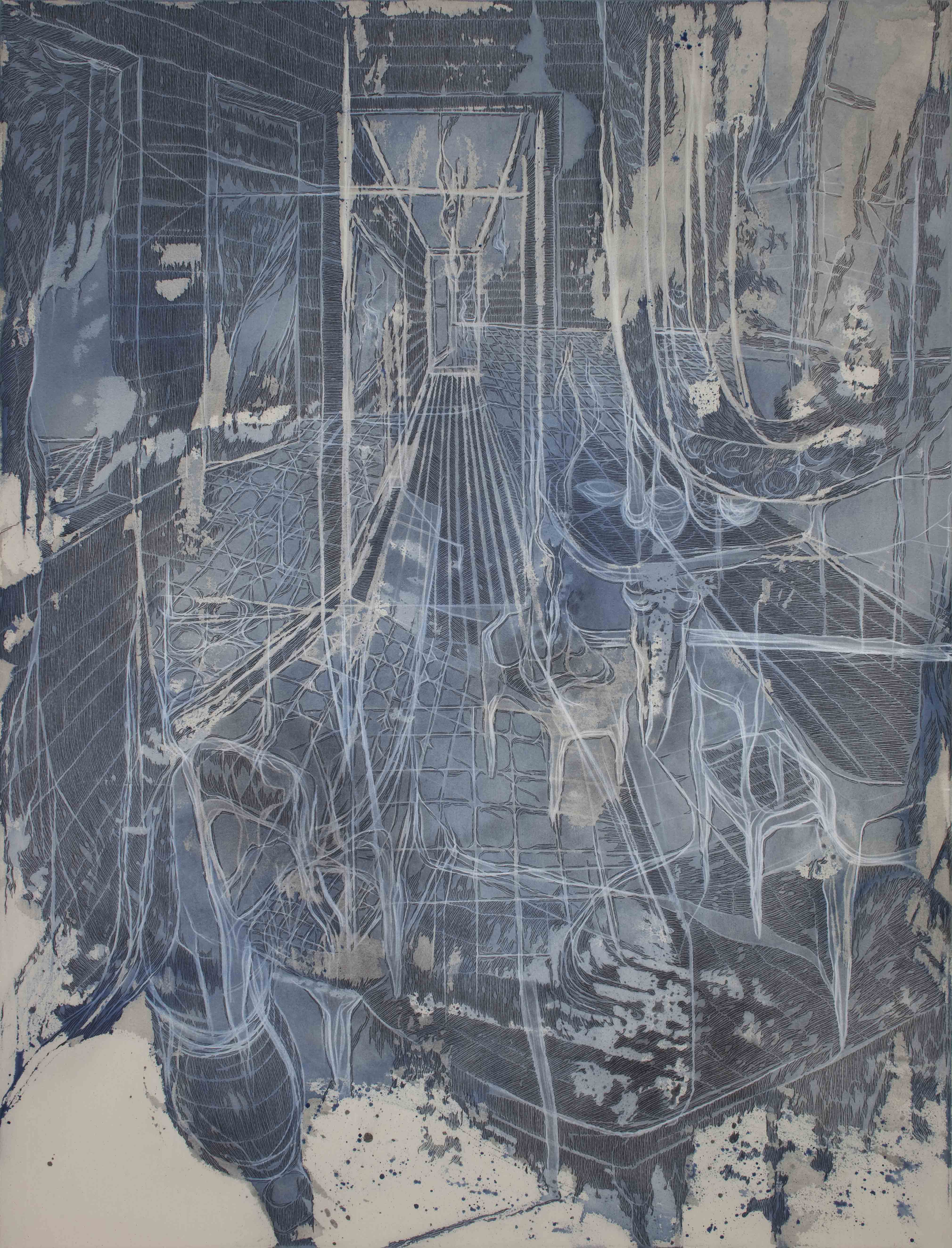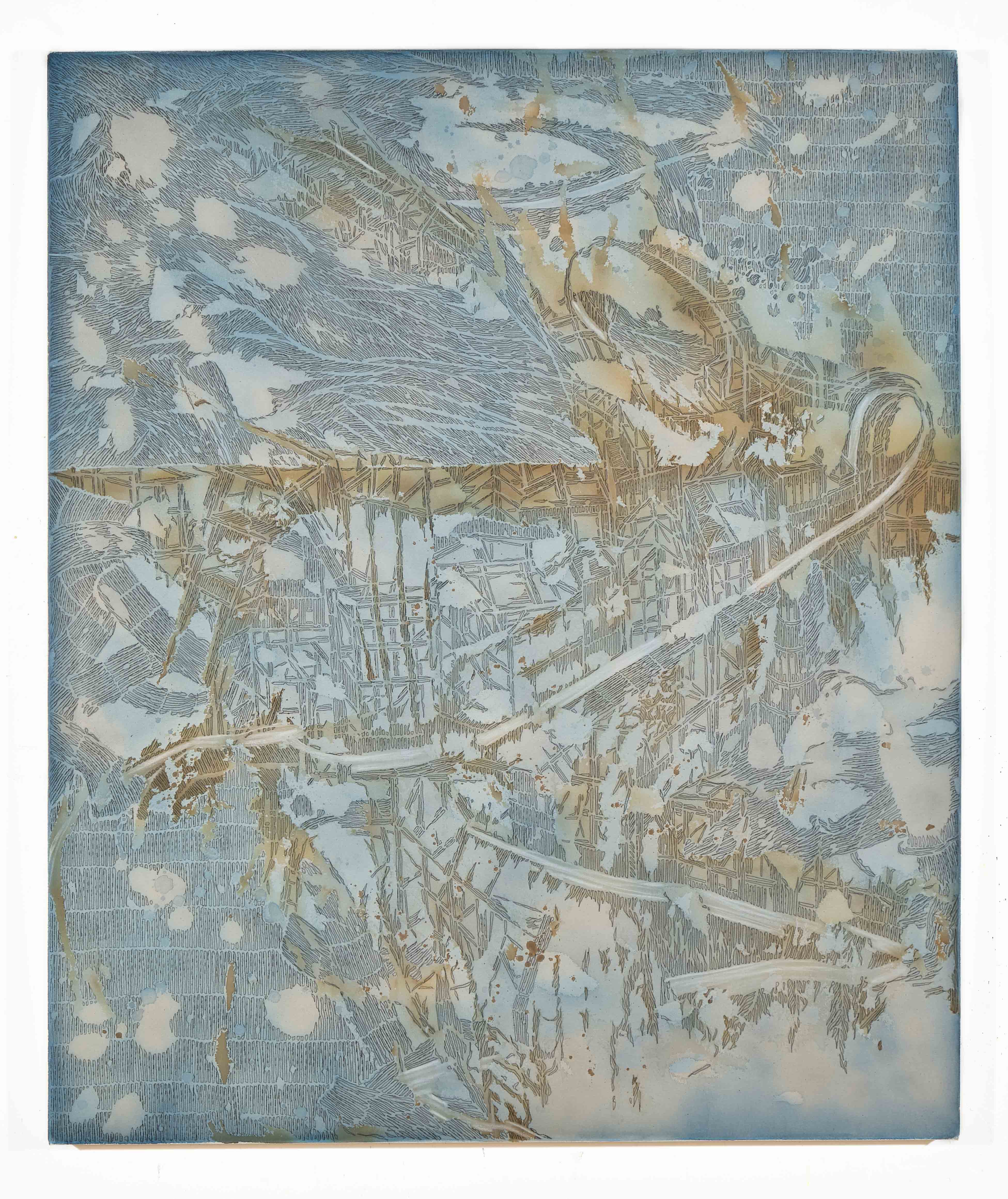 Il demiurgo Guerri parte dal caos, dalla macchia informale su tela grezza non lavata e idrorepellente. Qualcosa aderisce, si attacca, dichiara il suo desiderio di essere. Inizia così, oculata, una definizione con pastello a cera bianca che conseguentemente vedrà apparire i segni-mattoncini-tessere-cellule che sono anche matrice di questi universi epidermici e assieme stratificati in complessi spazio-temporali doppiamente sovrapposti.