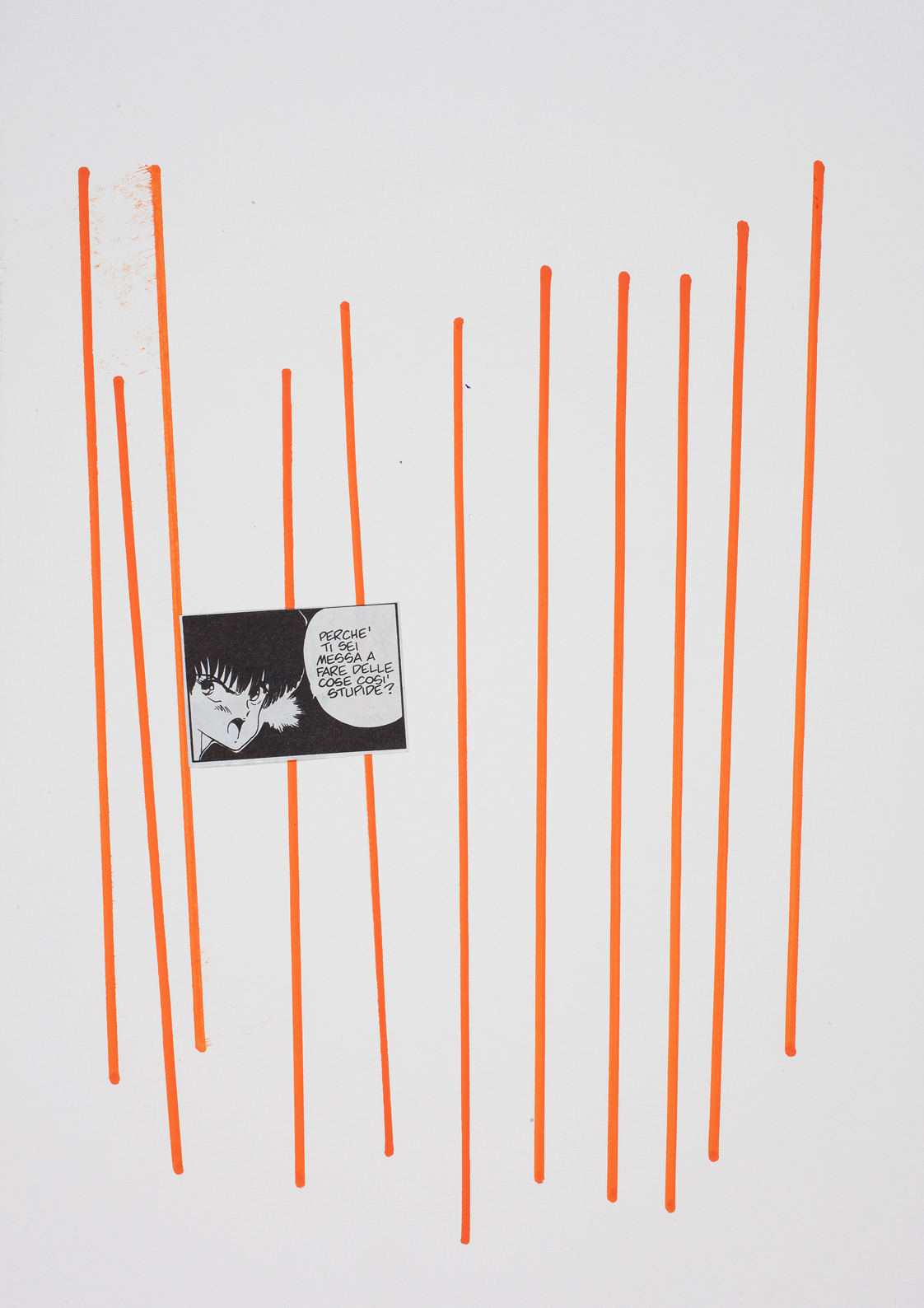 Luger usa l’accostamento di linee e parole, estratte da fumetti, per creare dialoghi incompleti o combinati arbitrariamente. Linee che fluttuano nello spazio e che insieme alle parole e alle immagini, formano un dialogo visivo di affermazioni incomplete, quasi senza senso.