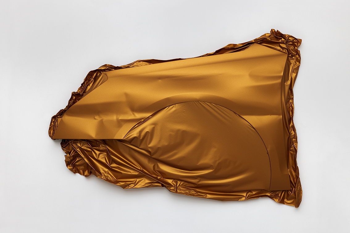 Con un gesto semplice, quasi pittorico, l’artista riveste le lamiere attraverso l’utilizzo del “wrapping”, tecnica utilizzata per lo più nel campo del car tuning o semplicemente per cambiare colore all’automobile in maniera non definitiva. Come in un panneggio, la qualità opaca e i colori metallici delle pellicole utilizzate da Maddalozzo enfatizzano la forma scultorea di unaparafango incidentato.