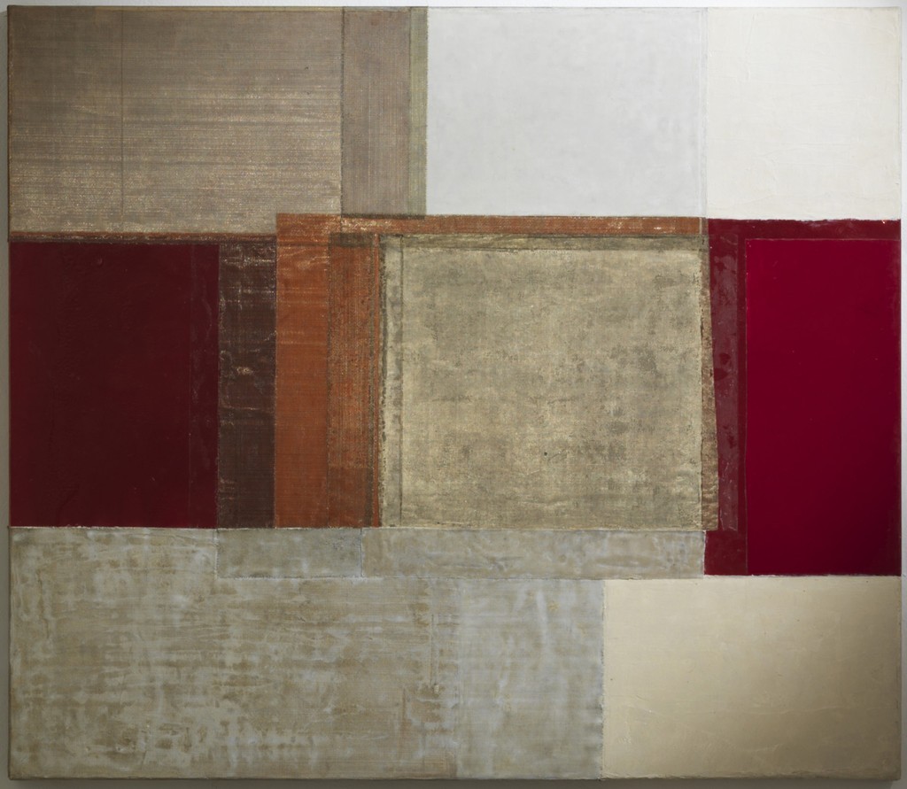 La pittura si manifesta tridimensionale. L’effetto retinico dei materiali plastici: gomma lacca, resine, siliconi e reti, trame metalliche si sovrappongono alla tela in un progetto orizzontale. Ne risulta una superficie con ampie campiture cromatiche, un tessuto sensibile allo sguardo e al tatto. Il colore è reindirizzato dalla luce, l’osservatore ne coglie gli sviluppi, la materia si modula comportandosi quasi in autonomia.
