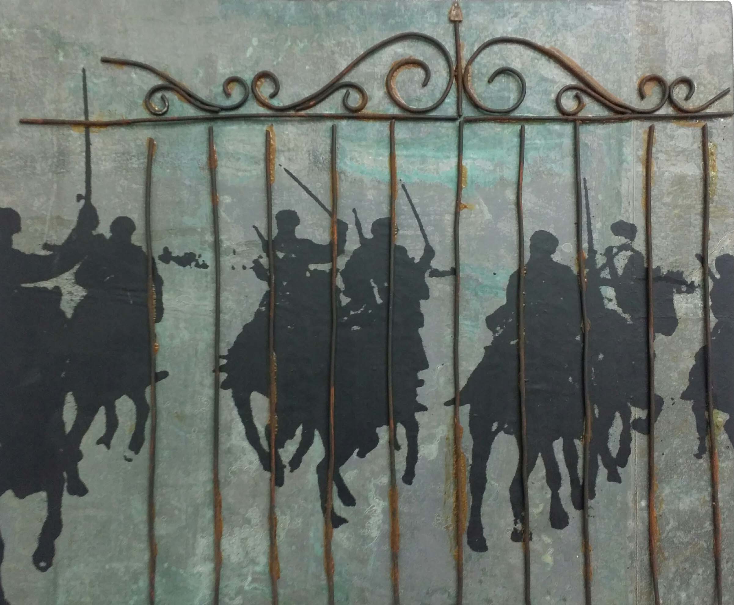 La drammaticità di quegli anni prende forma attraverso sculture e dipinti realizzati da Simonelli in differenti tecniche. In particolare il grande pannello dal quale prende il titolo la mostra evidenzia una serie di sagome di soldati, a capo chino, che camminano e si muovono a fatica in una densa nebbia di fumo. Un silenzio assordante accompagna la drammaticità della scena resa ancor più reale dai toni brumosi del dipinto stesso. Ad ogni passo sembrano “sprigionarsi” nuvole di polvere e terra, si sentono i rumori degli scarponi che affondano nel terreno mentre nell’aria si acuisce l’odore dei proiettili . Davanti al ricordo di quell’apocalisse si apre una voragine dantesca tinta di grida e lamenti. Lo spettatore, che nello specifico è ognuno di noi, assiste all’evento impotente, in balìa di un futuro che solo con l’impegno democratico potrà non ripetere tempi di eterne sconfitte, di dolore, di vittime innocenti.