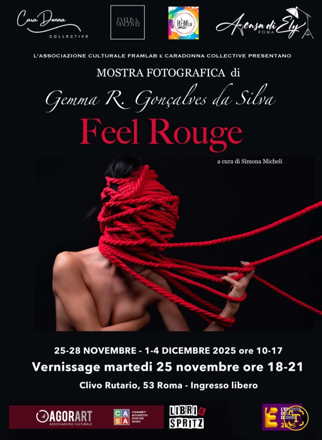Il festival è dedicato all’empowerment femminile che vuole raccontare la contemporaneità attraverso le sue protagoniste, per riscoprire il ruolo che le donne hanno avuto e continuano ad avere nei diversi campi del sapere e della società, e contribuire così al progresso e all’eredità che lasceremo alle generazioni future. Feel Rouge è una serie fotografica intensa e simbolica che mette in scena la tensione invisibile ma costante tra costrizione e connessione, tra prigionia e possibilità di liberazione. Protagoniste degli scatti sono donne di età e provenienze diverse, ritratte mentre interagiscono con corde rosse: segni tangibili di costrizione e silenzi imposti, ma anche fili che legano esperienze differenti in una rete di forza condivisa. Le corde escono dai fotogrammi per invadere lo spazio espositivo, trasformando l’allestimento in un intreccio fisico e metaforico che racconta la resistenza e la possibilità di riscatto. Ogni ritratto esplora una relazione diversa con la corda — chi la subisce, chi tenta di scioglierla, chi la trasforma — restituendo la complessità della resilienza femminile. La rete che si crea può imprigionare, ma se reinterpretata diventa alleanza, ascolto, presenza. Durante la mostra, le corde reali si estendono dalle immagini alle pareti e al soffitto, creando un ambiente immersivo che avvolge il pubblico in una rete visibile di connessioni, memorie e solidarietà. Feel Rouge è un invito a riflettere, sentire e agire, trasformando ciò che lega in ciò che libera. Il progetto nasce dalla collaborazione tra due donne che si sono incontrate per caso e riconosciute in una stessa visione: Gemma R. Gonçalves da Silva, fotografa, e Simona Micheli, direttrice dell’associazione culturale FramLab.
