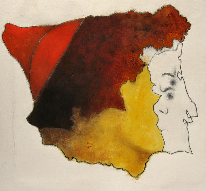 Oggi devo ancora farli i probabili pastelli, però li vedo come se li avessi qui davanti, già realizzati (alla stessa maniera li avevo davanti agli occhi qualche giorno fa), senza che ciò mi faccia venire meno la voglia di farli per davvero, il che è strano. In passato non sarebbe successo. Cosa sta accadendo? Beh, c’è la Spagna, più correttamente la penisola iberica, che tempo fa, con l’aggiunta di strade e fiumi, da Don Chisciotte passò a Frankenstein, e poi, senza i percorsi viari e fluviali, ma con il copricapo suo tipico, ad Arlecchino. E allora? E ora?