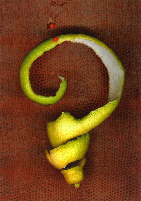 Una penna di alloro, la corteccia di un albero di Volterra, un ritratto d’artista tra i templi di Selinunte; fiori. Un cortile e un gruppo di alberi di Asolo. La pelle sottile di qualche cosa, paesaggi marini in pieno sole o notturni, e padani nella nebbia. Scogli di Capraia, voragini dell’Etna, il mare calmo e grigio della riviera di ponente. Una calla di scotch sporco, una scatola di asciugamani di lino. Un satiro sorridente e una baccante del Louvre in estasi. I pixel dell’artista-Ulisse di Rossi e Bava. I pixel-cretti di un’arancia di gesso impastato con fagioli secchi. L’acquietato interrogativo esistenziale della scorza di un limone con una sicura risposta. L’occhio di un’arancia e quello di un’altra che le sta accanto. La pelle rinsecchita e sfilacciata di un kaki svuotato. Una mela appassita, mummia da un decennio, con le sue ragnatele; la molle trama di un frutto su un rettangolo di juta, prima irrigidita da uno strato di colla vinilica, poi resa fluida da acqua piovana caduta su un pezzo di vetro.