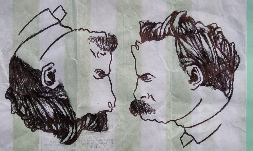 19 dicembre, ore 18. Della terza parte ho finito anche la tavola (il cartone) di 29,5x39,5 centimetri con il quartultimo discorso, “Il convalescente”, e il terzultimo, “La grande nostalgia”. Ho disegnato Zarathustra e Nietzsche, Nietzsche e Zarathustra a penna con lumeggiature bianche, lumeggiature, queste, poco visibili sul colore grigio del fondo, mentre reggono la struttura dell’immagine, con l'aiuto di un contrappeso scuro, nel blu dei disegni dell’ultima parte. Accenni di lievi tratti chiari ho inserito, sui profili del poeta e del profeta, nel trentesimo disegno coi discorsi “Dello spirito di gravità” e “Delle antiche tavole e delle nuove”.