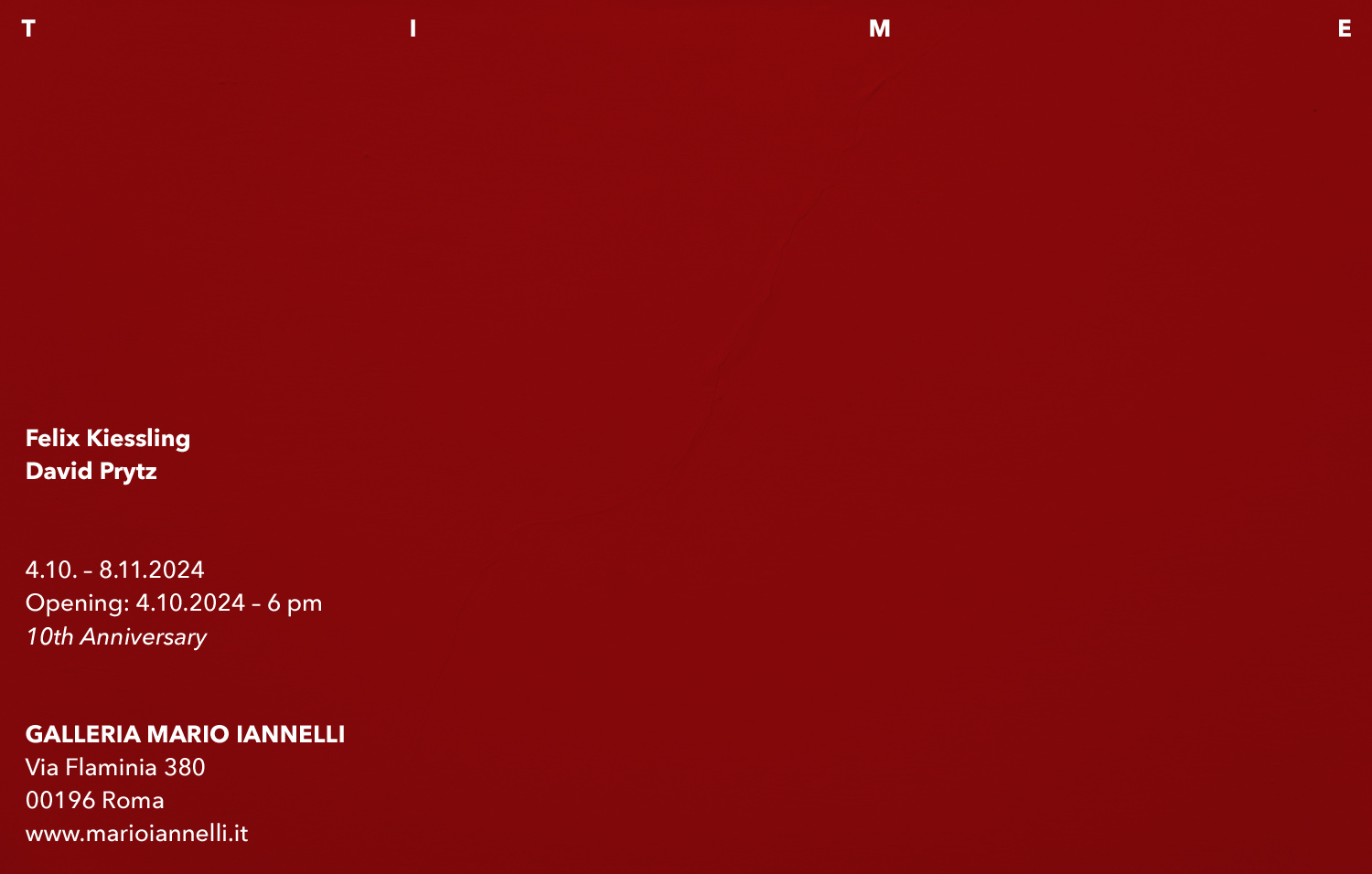 La Galleria Mario Iannelli è lieta di annunciare “TIME”, un progetto che celebra il suo decimo anniversario con un evento che presenta nuove opere di David Prytz e Felix Kiessling, che hanno inaugurato il suo programma con mostre personali nel 2014-15.