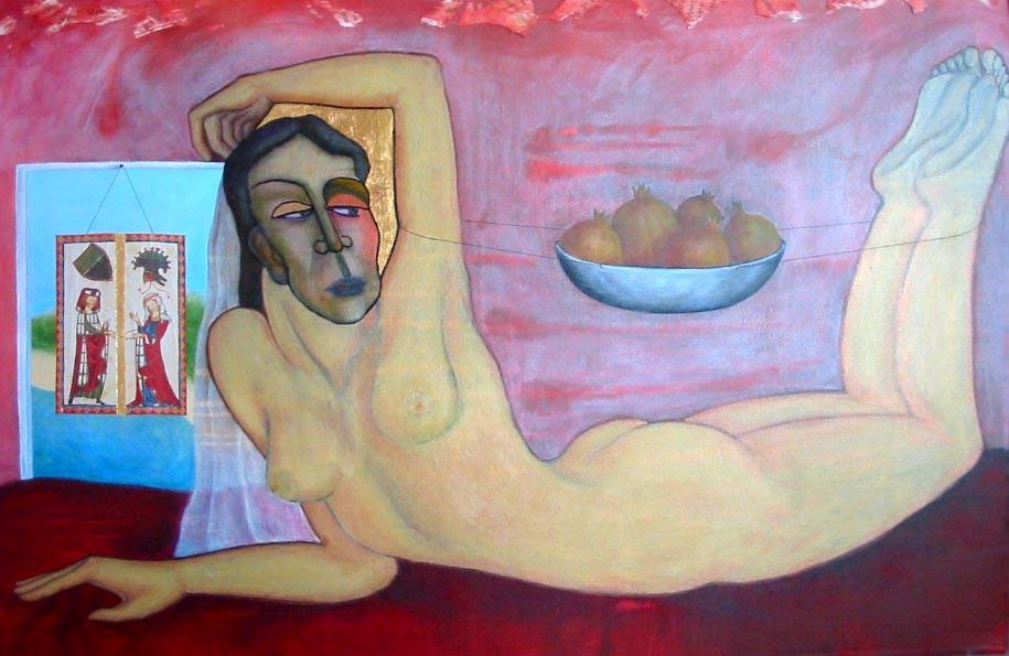 La multiforme ricerca estetica di Fernanda Sanna è una riflessione sul senso dell’esistenza. Essa si muove sul filo dell’impossibilità espressiva della condizione umana, della mancata realizzazione dell’individuo davanti alla caducità del destino. La necessità di esprimere il disagio esistenziale converge nell’opera dell’artista attraverso l’oggettivazione del sentimento che si riscontra fin dalla prima incisiva opera: La Sposa. Il suo volto scuro è una grottesca maschera d’ispirazione goyesca dallo sguardo sommesso. Immobile, silenziosa, essa si concede all’amato consapevole dell’indissolubilità dell’unione e del sacrificio che dal vincolo scaturisce. Con gesti lenti e suadenti, il suo corpo nudo si contorce per tendere l’esile filo che precariamente sostiene un canestro colmo di melegrane, i cui vermigli chicchi sancirono l’unione tra Proserpina e Plutone.