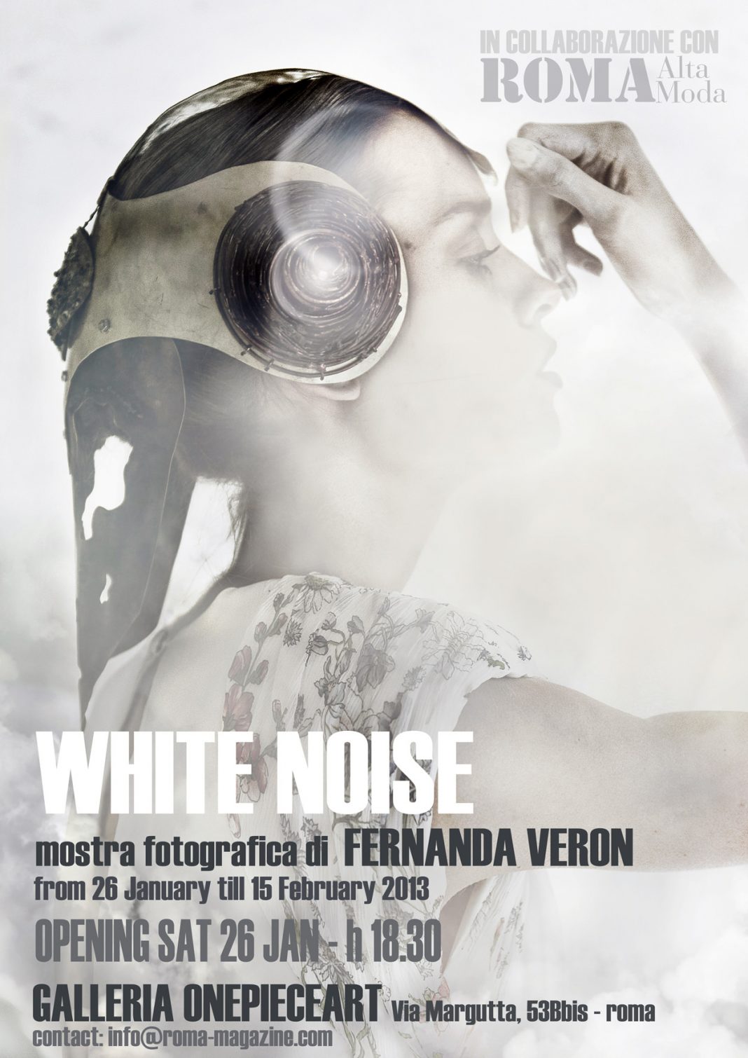 "White Noise" nasce dal progetto editoriale realizzato da Fernanda Veròn per ROMA Alta Moda 2013, alla sua edizione. L'artista interagisce con il mondo della moda, lo fa con trasparenza e sublimazione, inglobando un mondo fatto di stoffe e di statue e viventi, avvolte da un paesaggio tra terra e cielo, così, le modelle vestite da "ago e filo" vengono ricamate tra trame di paesaggio sospeso da nuvole bianche e tempestose. Il rumore del bianco evocato dalle atmosfere brinate e celestiali trasfigurano l soggetti marmorei come antiche statue di miti femminili dallo sguardo regale e guerriero, come a dire un viaggio attraverso il tempo della femminilità. Fernanda Veròn un artista multisensoriale, lavora sui piani sottili dove la materia diventa malleabile anche dopo lo scatto fotografico. Il suo carallere pittorico esalta lo spirito dei sensi attraverso le immagini che trovano spazio nel reale, una costante volontà di trasfonnare l'invisibile dell'anima in un percorso emotivo, dove l'occbio guida le emozioni più inconsce. L'artista da tempo sperimenta tematiche che hanno dato spazio a espressioni di contemporaneità in senso artistico tra tinte, atmosfere, soggetti ma che in realtà non hanno tempo perché le sue immagini raccontano storie e che spesso emergono come da scatole magiche. Veron, artista Argentina, si è trasferita a Roma per studi accademicI e ha continuato il suo percorso lavorativo nella capitale, fino a oggi, partecipando a varie edizione del Festival della Fotografia Internazionale di Roma e a mostre itineranti in Italia e all'estero; sin dagli inizi le sue opere trovano natura nel mondo analogico e sperimentale della fotografia: oggi, in questa mostra, l'artista ha voluto ricreare una prima congiunzione tra i due mondi, tra arte e moda. Due mondi che attraverso l' occhio del diverso diventano un opera unica.