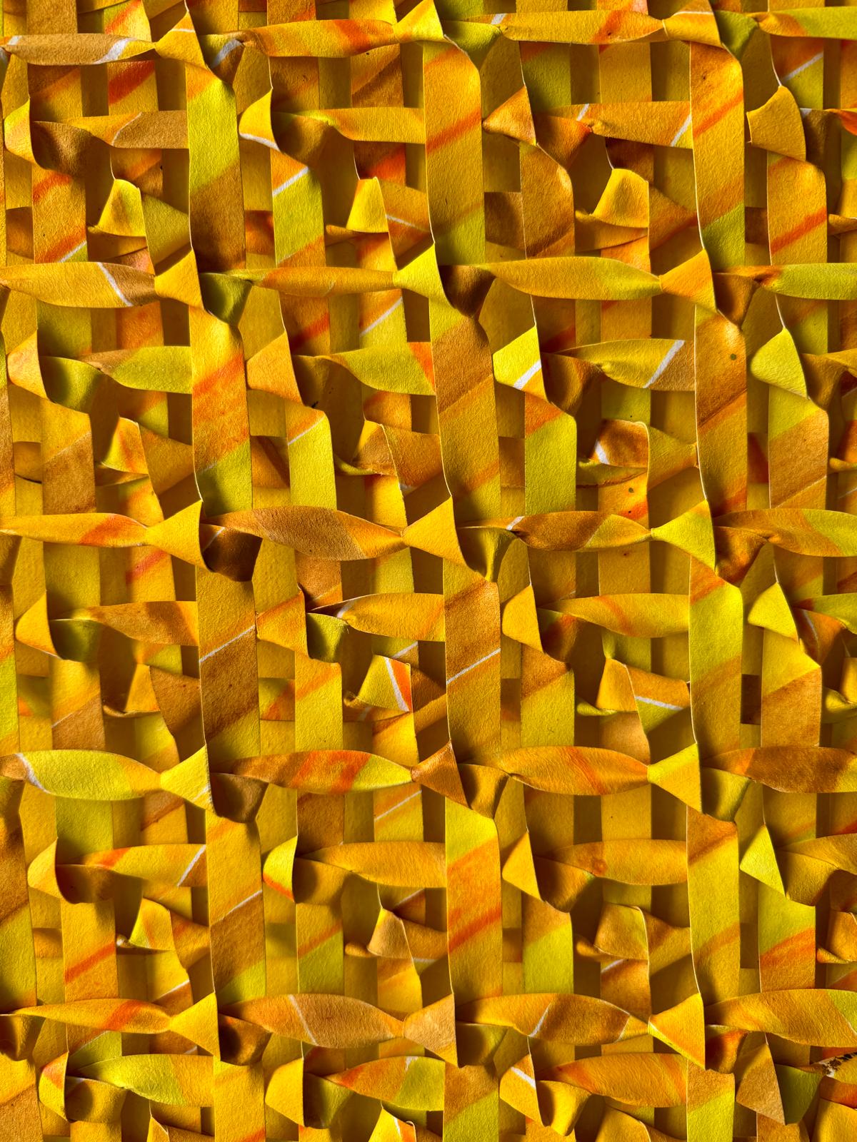 Garbellotto è noto per essere il pittore dei frattali, infatti questa figura geometrica, scoperta non molti anni fa (nel 1975 da Benoît Mandelbrot), costituisce il contenuto “scientifico” delle sue opere. Non a caso, oltre al termine/concetto “frattale”, anche “nodo” e “rete” (termini per descrivere la concretezza delle opere dell’artista) appartengono al campo delle scienze. L’artista compone il suo lavoro annodando strisce di tela pittorica che si ripetono costantemente in maniera simile a quanto avviene nei frattali creando una trama di interrelazioni, la rete, punto di arrivo del passaggio dall’insieme al sistema. Nelle sue opere la tela non è più supporto pittorico ma, tagliata e riassemblata, diventa lo strumento per tessere e dar corpo alla complessità della natura. Nella realizzazione dei nodi trasferisce energia alla materia facendola diventare sistema.