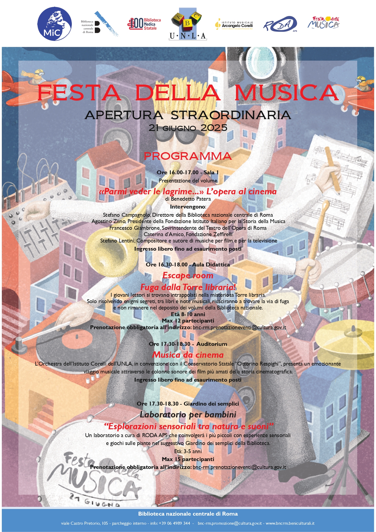 Il 21 giugno, in occasione della Festa della Musica 2025, la Biblioteca nazionale centrale di Roma organizza una serie di eventi per celebrare l’arte musicale in tutte le sue forme. Dalle 16:00 in poi vi aspettiamo con la presentazione del volume “«Parmi veder le lagrime...» L'opera al cinema”, con attività per bambini - dall'escape room dal titolo “Fuga dalla Torre Libraria!” a un laboratorio nel Giardino dei semplici dal titolo “Esplorazioni sensoriali tra natura e suoni" - per concludere con il concerto “Musica da Cinema” dell’Orchestra dell'Istituto Corelli, in collaborazione con il Conservatorio Statale "Ottorino Respighi", che presenta un emozionante viaggio musicale attraverso le colonne sonore dei film più amati della storia cinematografica.