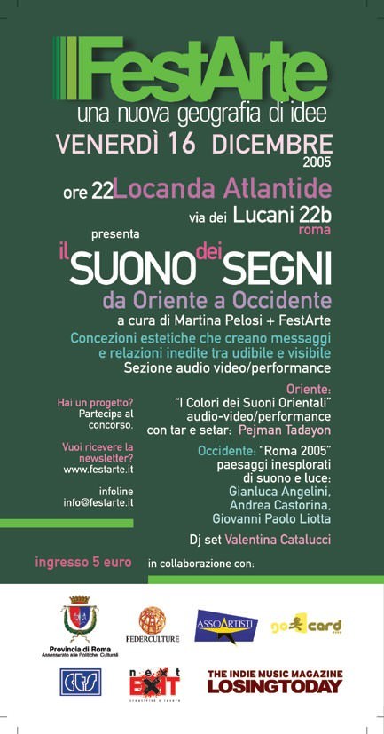 Artisti: 1°performance: “I colori dei suoni orientali” - Pejman Tadayon: performer /proiezioni video, tra pittura e musica con tar e setar ; 2°performance: “Roma 2005” - Gianluca Angelini, Giovanni Paolo Lotta: sezione acustica; Andrea Castorina, Andrea De Simone: sezione grafica.MUSICA: Dj set in via di definizione a cura di LOSINGTODAY