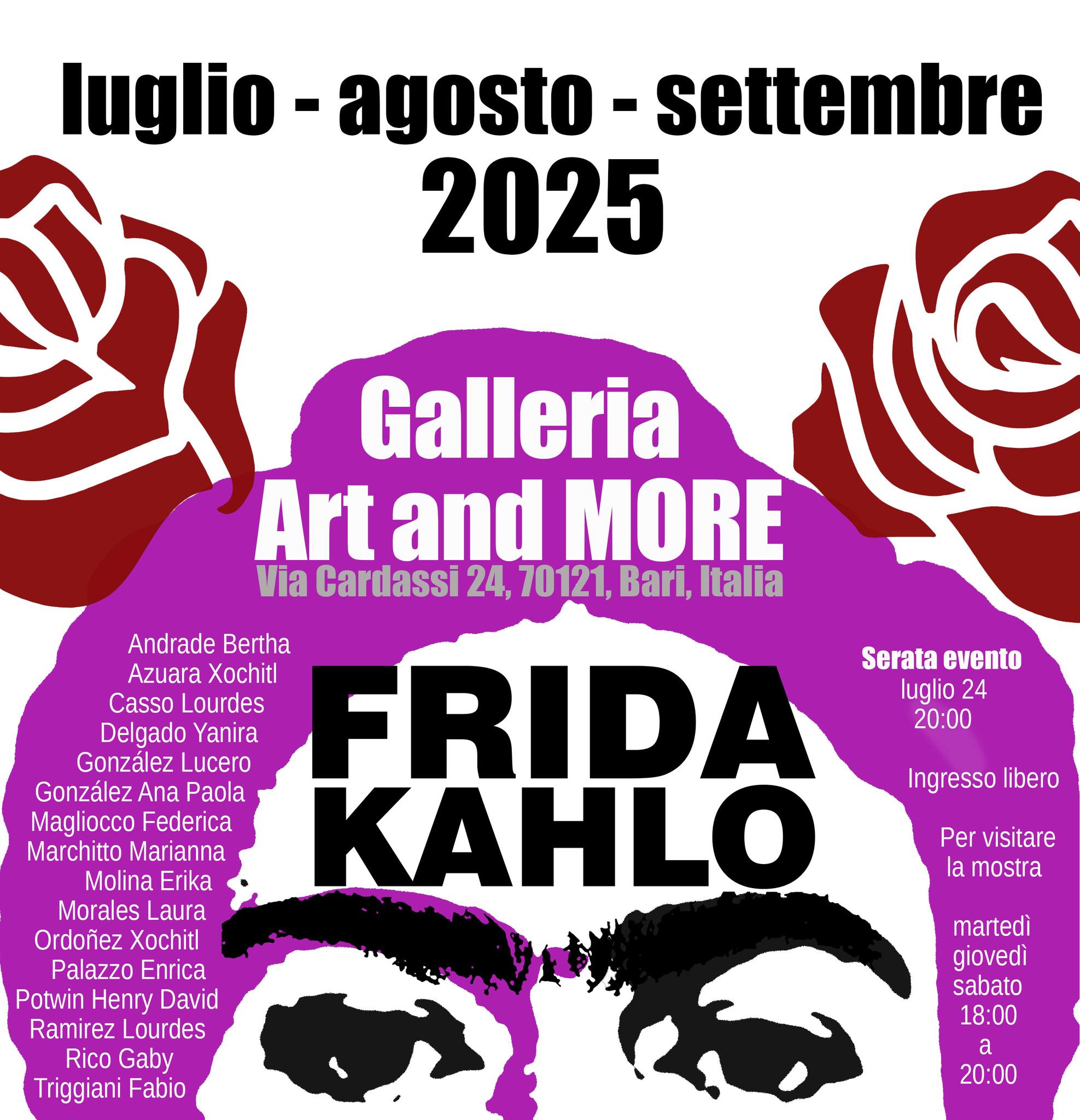 “Viva la Vida!” alla Galleria Art and More: mostra evento su Frida Kahlo. Artisti reinterpretano l’iconica pittrice messicana con dipinti, workshop, musica e approfondimenti. Ingresso libero. A Bari da luglio a settembre, mart/giov/sab h18-20. Info 3452222454.