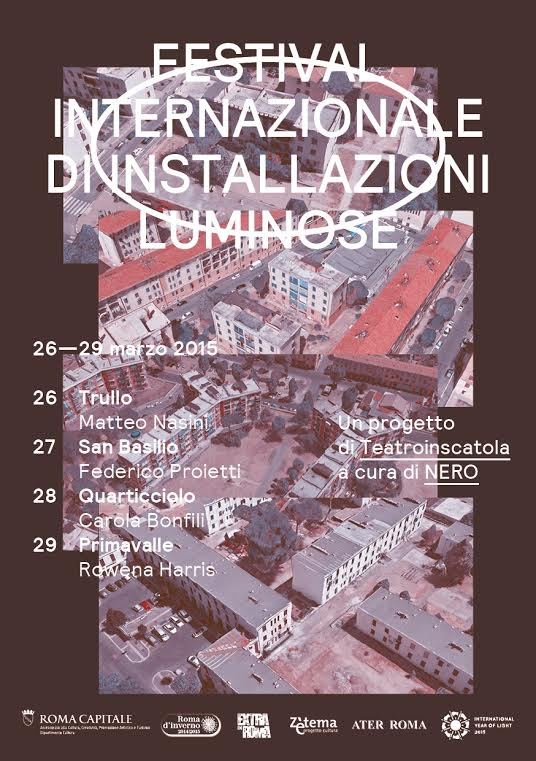 si svolgerà a Roma, dal 26 al 28 marzo, il Festival Internazionale di Installazioni Luminose, progetto di Teatroinscatola, in collaborazione con NERO. La manifestazione, realizzata in occasione dell’Anno Internazionale della Luce, mira alla riqualificazione delle borgate romane ex IACP, ora Ater, attraverso interventi di artisti visivi internazionali, quali Matteo Nasini, Rowena Harris, Carola Bonfili, e Federico Proietti, nelle aree di Trullo, San Basilio, Quarticciolo, Primavalle.