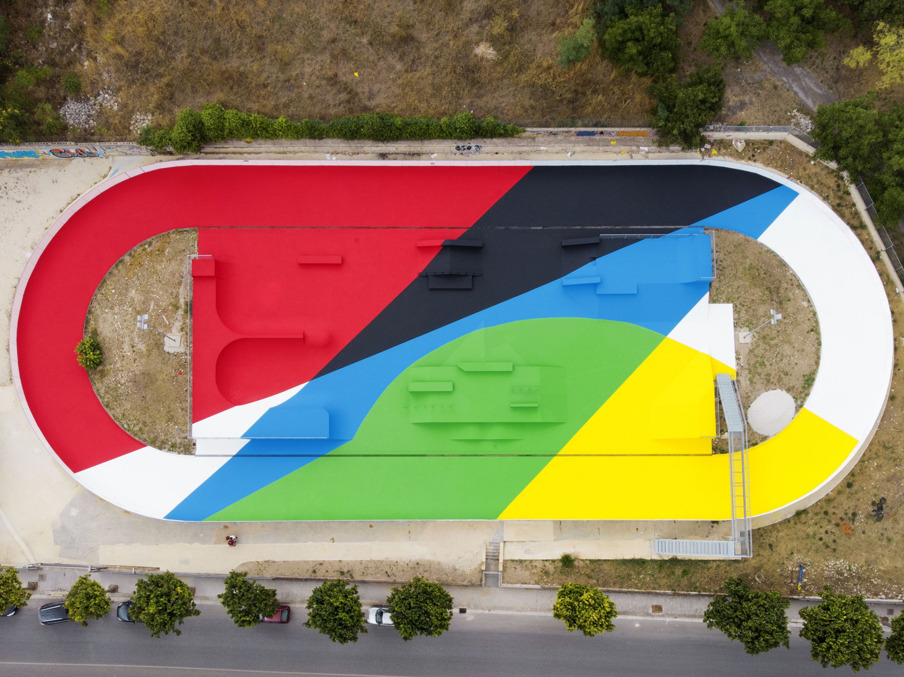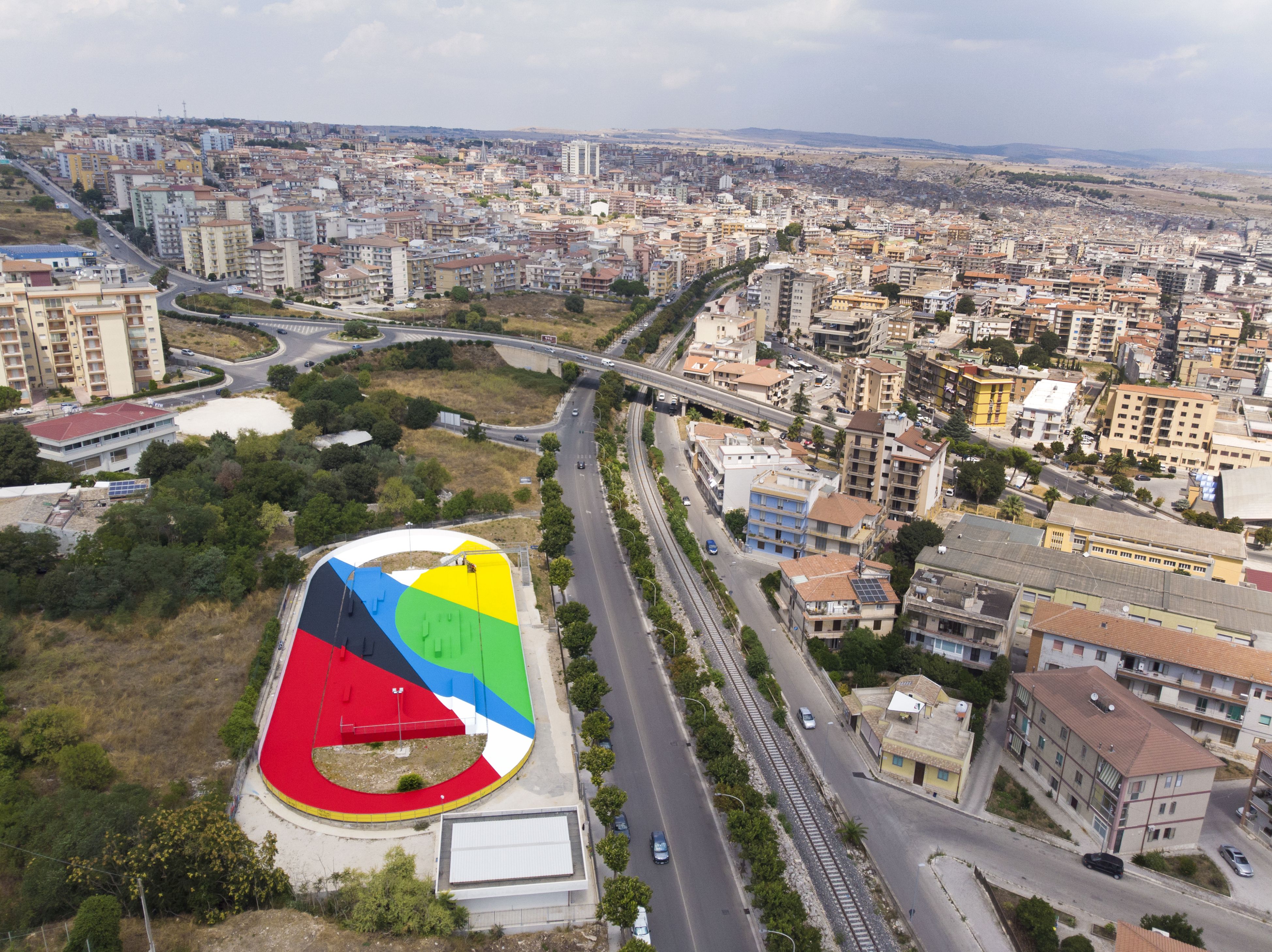A rendere speciale l’headquarter, intrecciando immagini, musica e poesia, la prima opera realizzata per FestiWall 2019, “Traiettorie e Forme”, che Elian Chali ha finito di dipingere in questi giorni sulla superfice orizzontale dell’impianto sportivo, nello stile astratto e minimale che lo ha reso celebre in tutto il mondo: un linguaggio caratterizzato dall’uso dei colori primari e dalla sovrapposizione di linee ed elementi geometrici essenziali, alla ricerca di un dialogo tra la prospettiva di chi osserva e l’ambiente circostante.