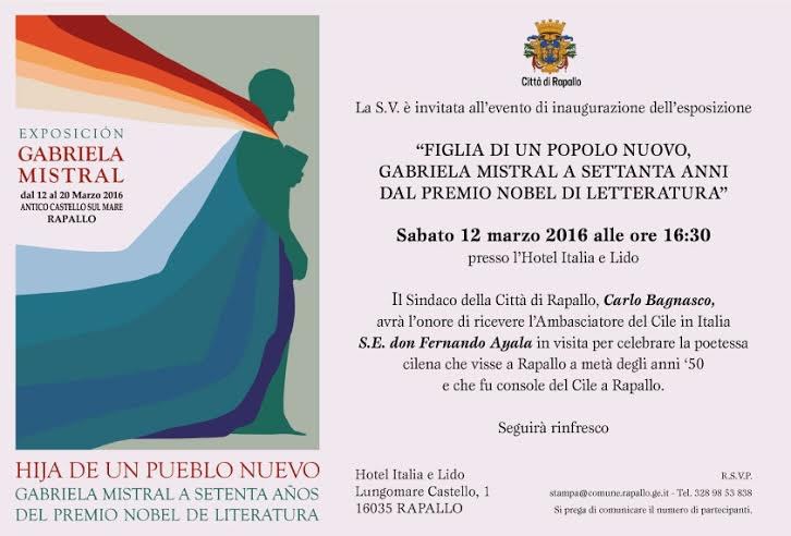La mostra, che ricorda i particolari e gli avvenimenti che accompagnarono l’assegnazione del Premio Nobel per la Letteratura della scrittrice e poetessa nel 1945, sarà visitabile presso l’Antico Castello sul Mare, al secondo piano, dal 12 al 20 marzo 2016