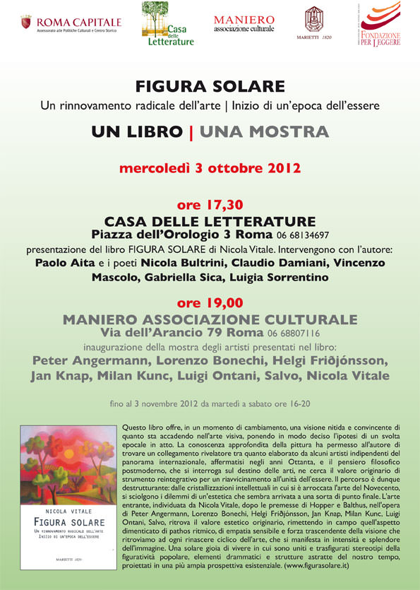 di Nicola Vitale (Ed. Marietti), presso la Casa delle Letterature, Piazza dell’Orologio, 3 Roma, che si svolgerà alle ore 17,30, alla presenza dell’autore e con gli interventi di Paolo Aita e dei poeti Nicola Bultrini, Claudio Damiani, Vincenzo Mascolo, Gabriella Sica, Luigia Sorrentino, si terrà in galleria l’esposizione di alcune opere degli artisti presentati nel libro: Peter Angermann, Lorenzo Bonechi, Helgi Friðjónsson, Jan Knap, Milan Kunc, Luigi Ontani, Salvo, Nicola Vitale.