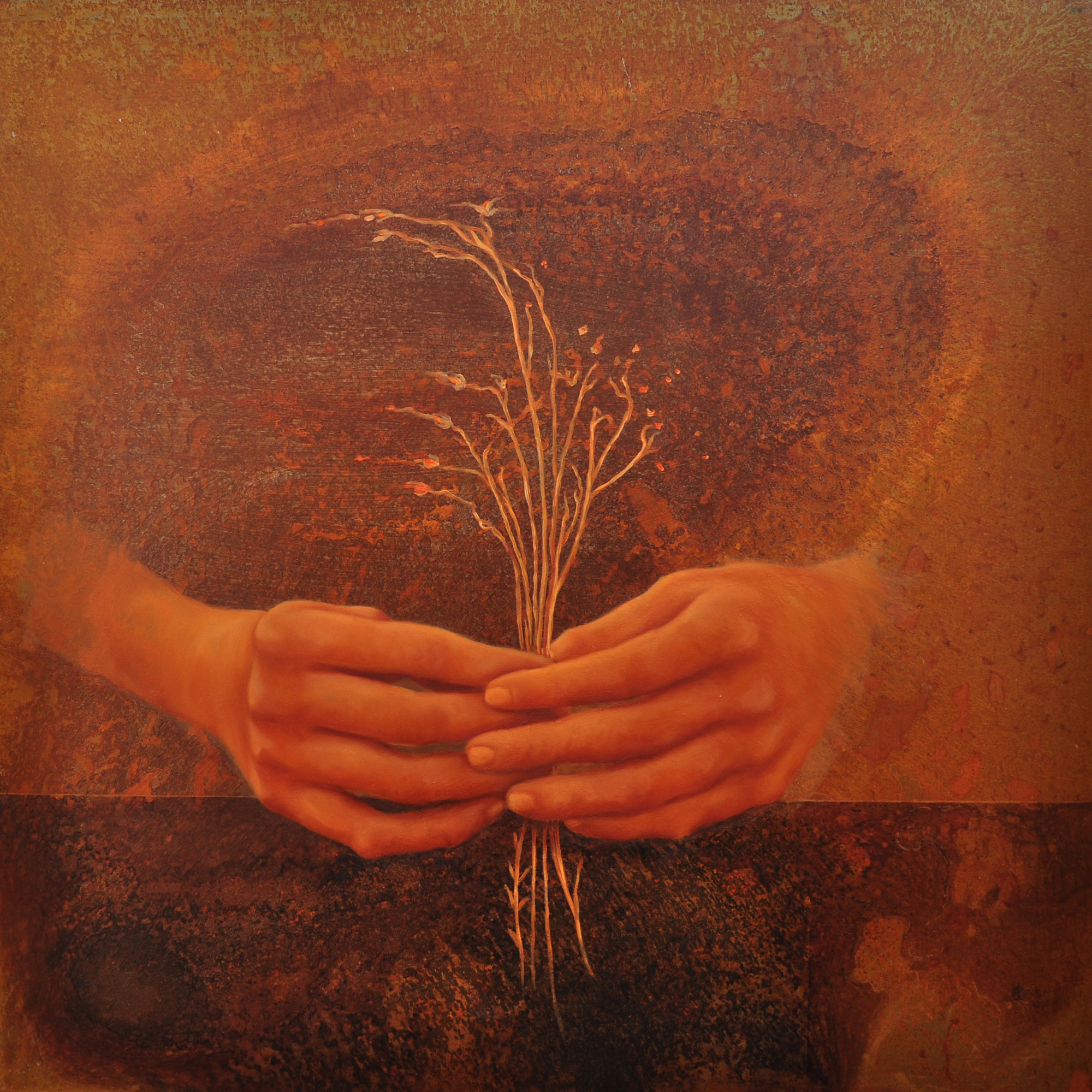 Roberta Ubaldi continuando la sua ricerca sulla corrosione, realizza per AGAIN opere in cui mani affioranti dal supporto metallico proteggono esili arbusti, come fragili offerte di pace.