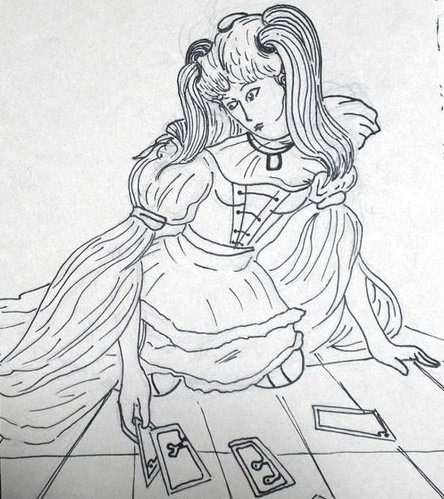 Nelle due pagine che seguono Biagioli e Mattiello ci presentano due cinematografiche inquadrature ravvicinate: nella prima, un rospo verde (principe e diavolo, critico e storico dell’arte dai poteri taumaturgici su colori e forme) magrittianamente pensa ai tratti di pastello come segni e disegni e non solo come illusiva pioggia (pur potendone evocare i poteri rasserenanti e consolatori), quindi, sulla rinnovata autostima provocata in Tecla, diventa spinta vitale alla sua salvezza dall’inedia; e da lì si dipana la storia. Nella seconda, le delicatissime mani di Tecla circondano, in un abbraccio affettuoso, il rospetto che è il suo unico amico e che, portandole – attraverso un foro nel muro che comunica con l’esterno – a più riprese rametti e foglie, fa sì che con questi strumenti e con le carte già in suo possesso possa evocare la formula magica che le permetterà, essendo diventata invisibile, di evadere dalla tetra prigione nella quale l’aveva rinchiusa il Priore Nunzio Edoardo.