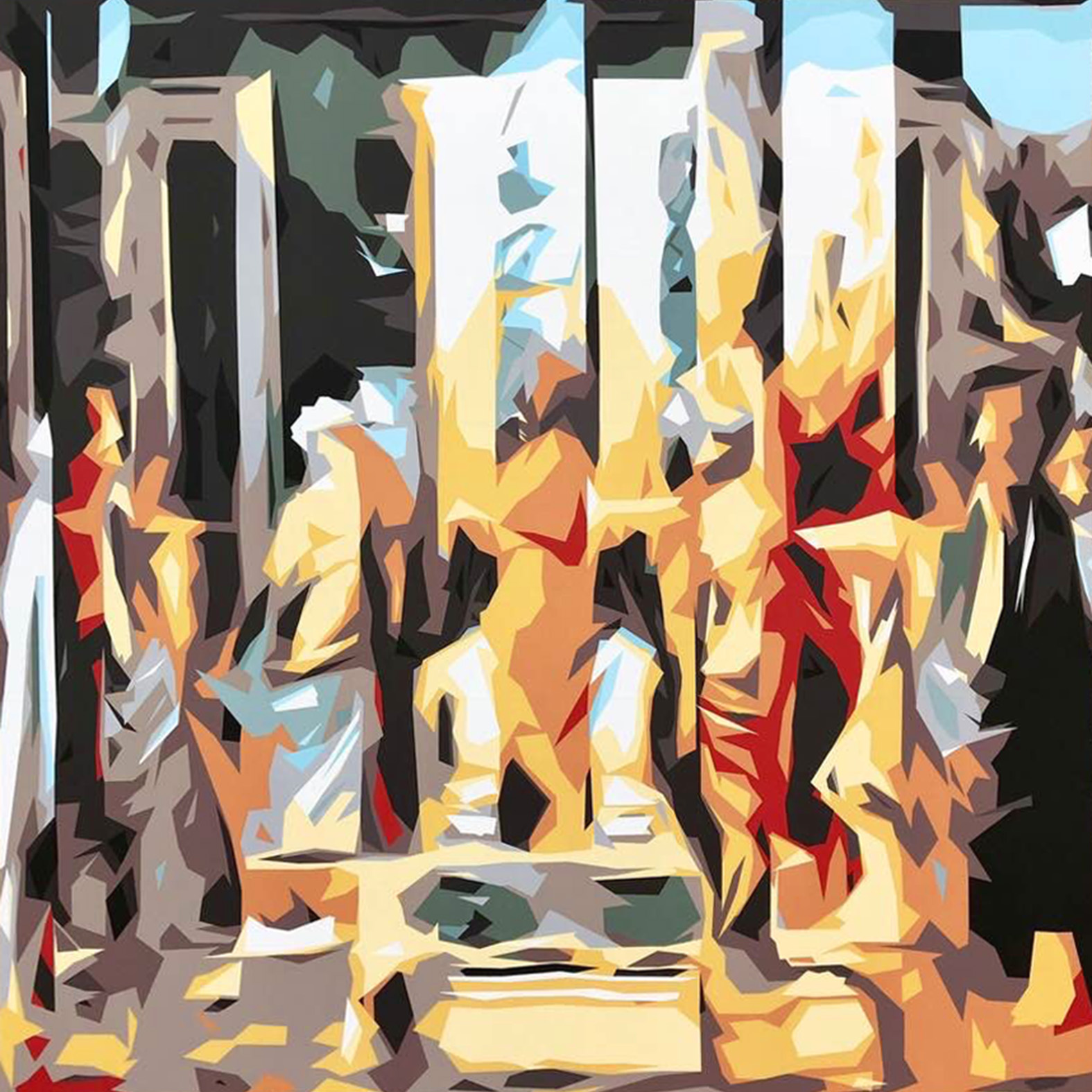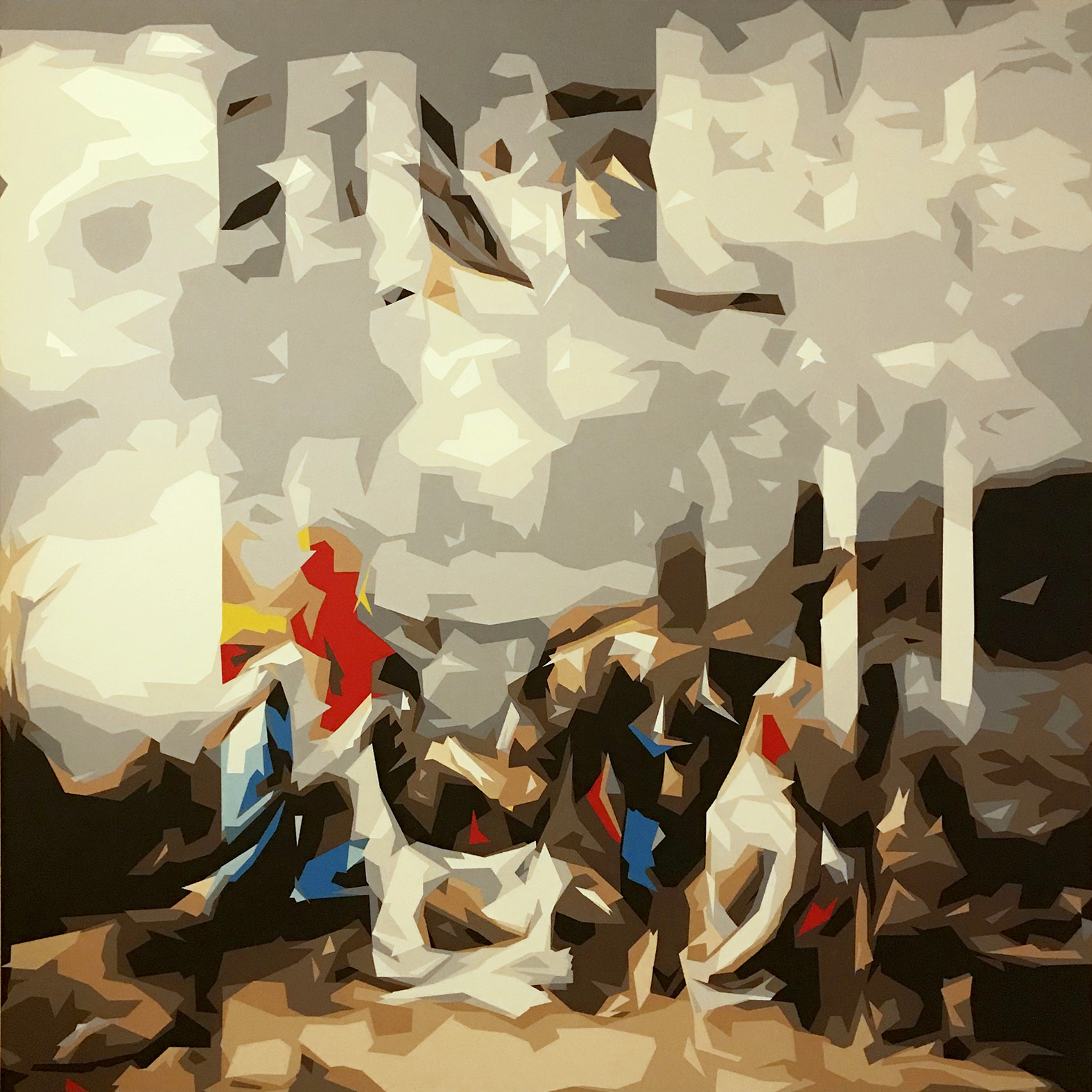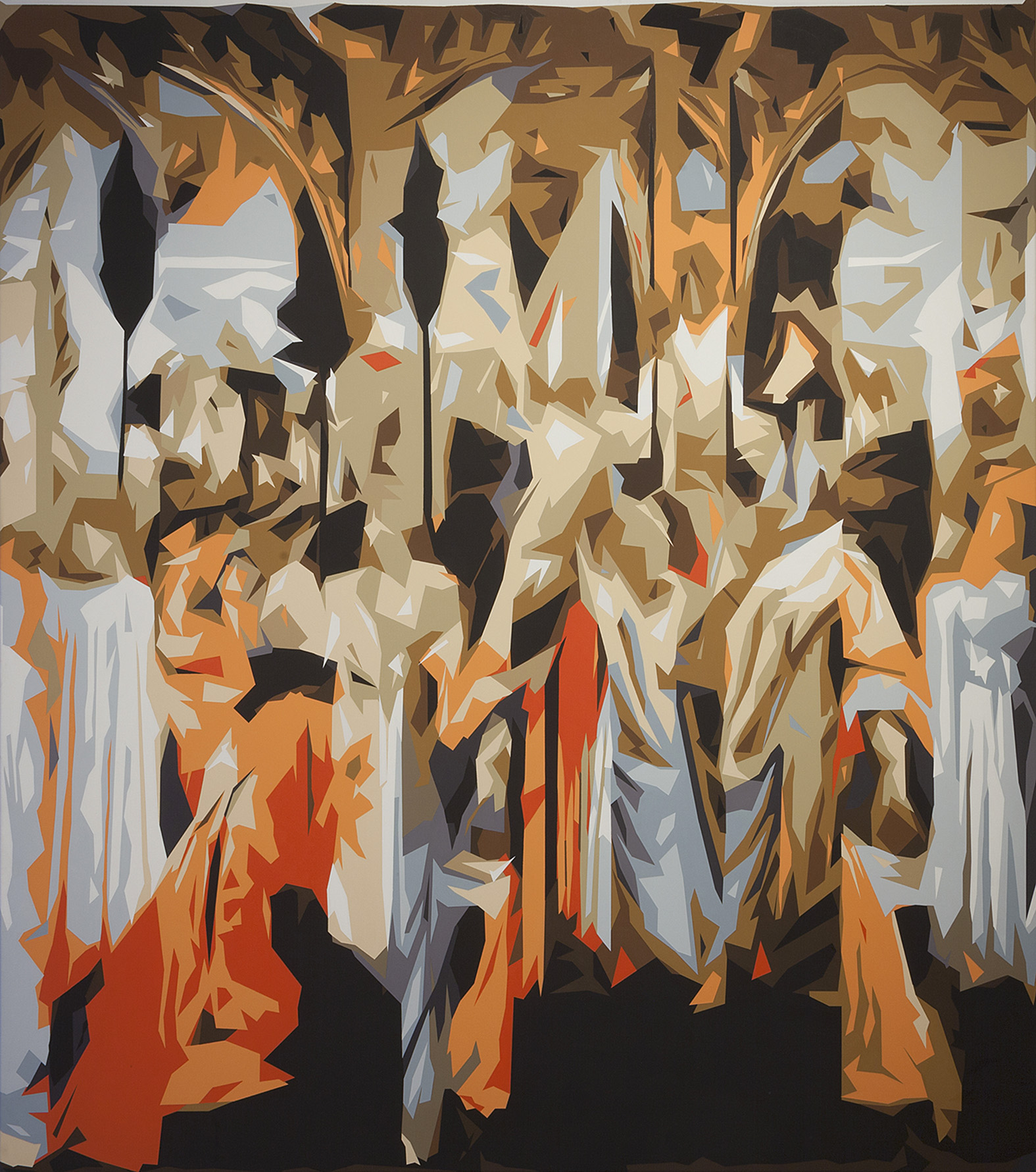 “Anagrammi” di Filippo Ciavoli mette presenta una serie di acrilici su tela che invitano a riflettere sul rapporto tra evoluzione tecnologica e strumenti tradizionali, tra identità storica e mutamento, irrappresentabilità e geometrie ineccepibili.