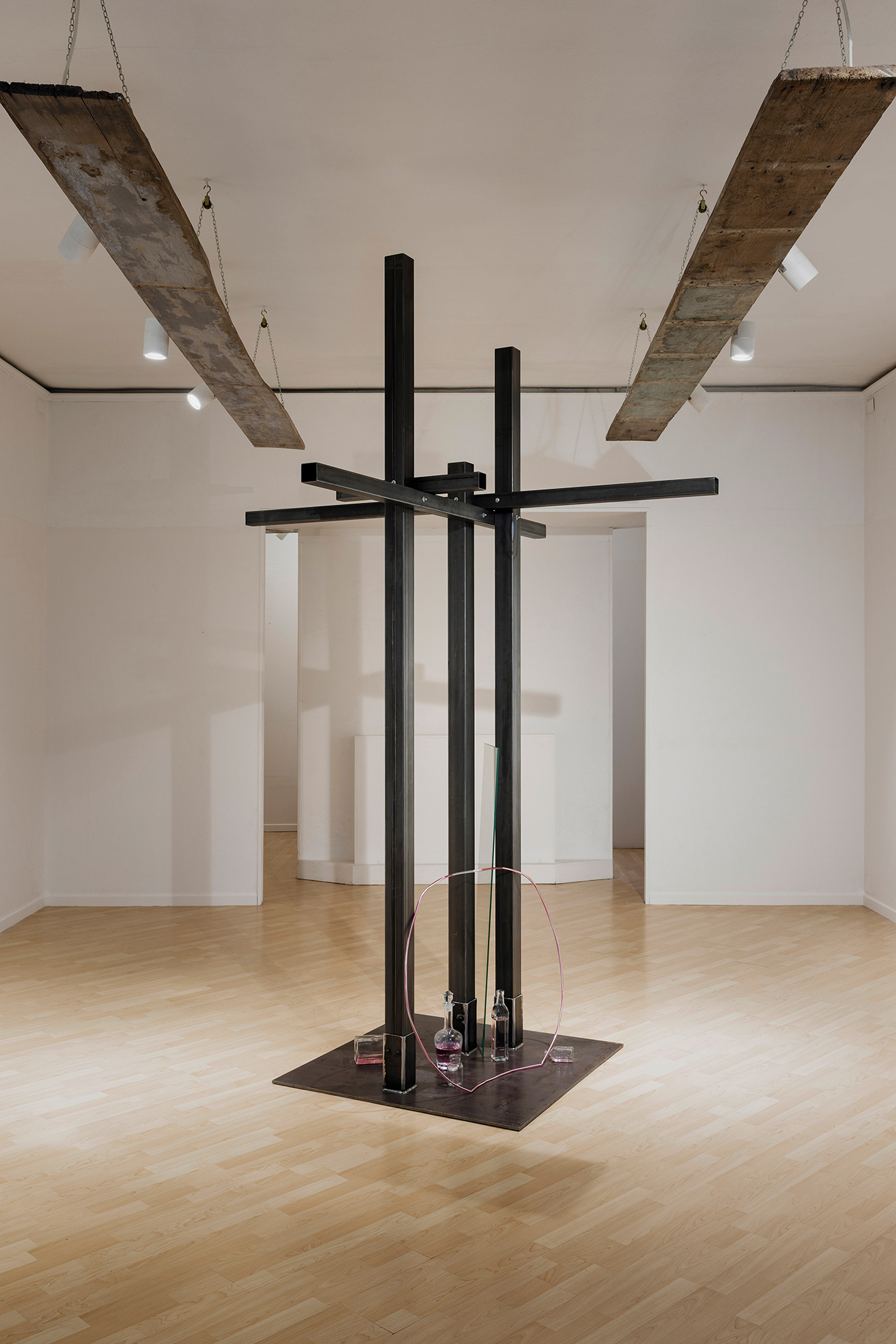 L’esposizione raccoglie dieci lavori inediti. Questo nuovo progetto mostra l’evoluzione della ricerca di Filippo Cigni mediante una serie di opere eseguite impiegando materiali di varia natura, lavorati con estremo rigore costruttivo, quali vetro e metallo, quest’ultimo trattato e bruciato.