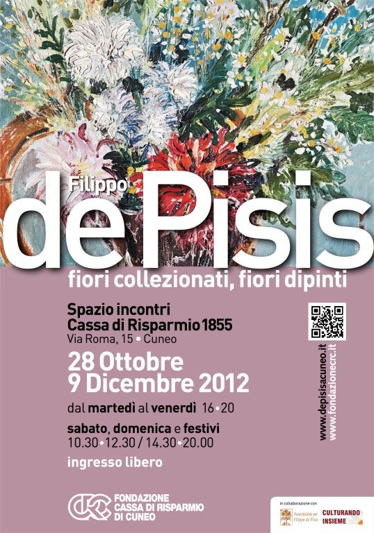 Filippo de Pisis: fiori collezionati, fiori dipinti. Spazio incontri Cassa di Risparmio di Cuneo 1855 - Via Roma 15, Cuneo. Dal 28 ottobre al 9 dicembre 2012: dal martedì al venerdì ore 16-20, sabato, domenica e 1 novembre ore 10.30-12.30 e 14.30-20. Disponibilità di visite per scuole al mattino dei giorni feriali.