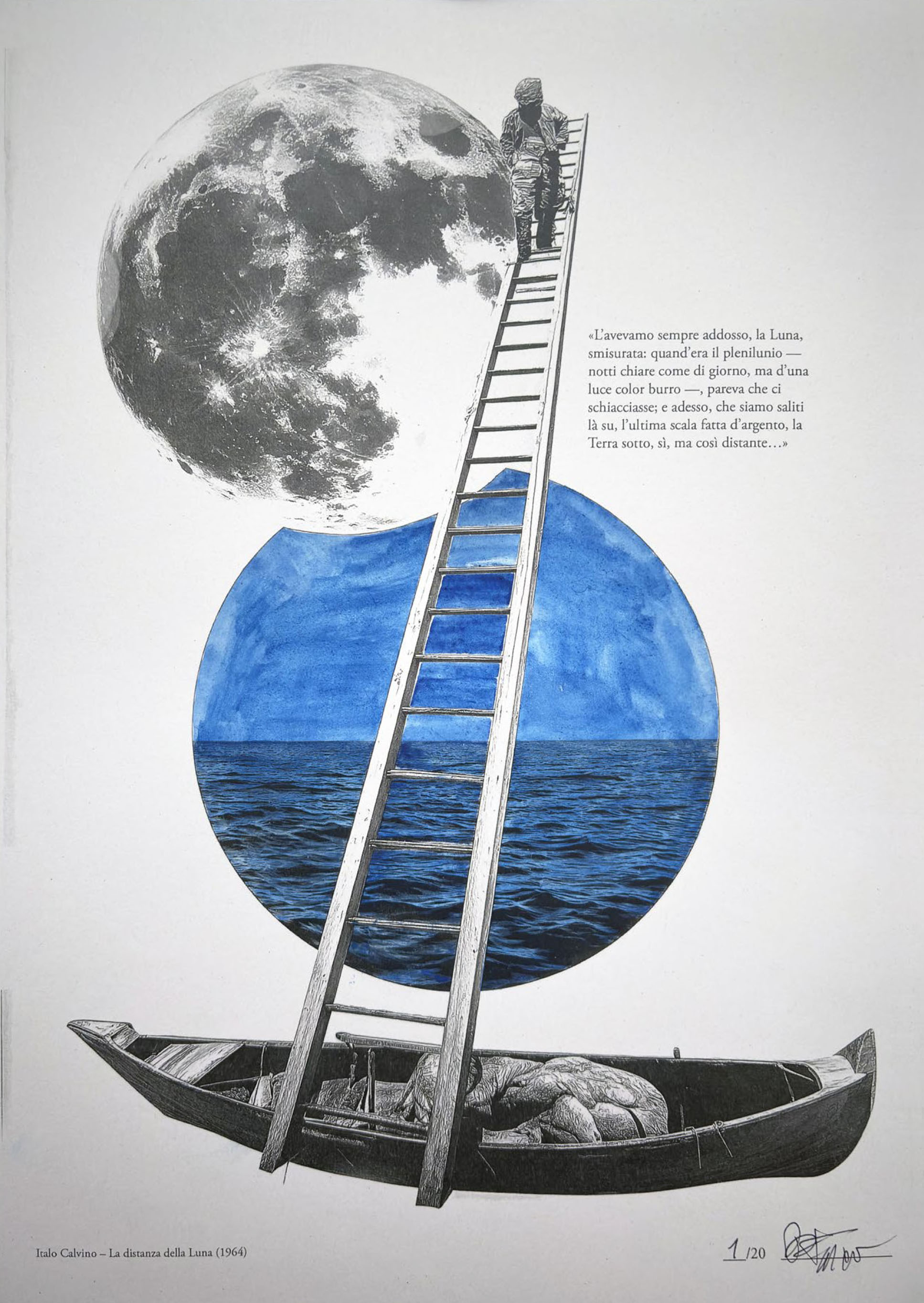Dalle ore 18:00 si proseguirà presso la sede della Galleria dove saranno presentati due corpi di lavori inediti che costituiscono la parte centrale della mostra di Filippo Riniolo: Cielo di Inchiostro e Sfere Celesti. Cielo d'Inchiostro è un progetto costituito da dieci stampe nelle quali dieci grandi autori della lingua italiana interpretano la LUNA. Alda Merini, Ludovico Ariosto, Italo Calvino, Cesare Pavese, Dante Alighieri, Giacomo Leopardi, Pier Paolo Pasolini, Luigi Pirandello, Maria Luisa Spaziani, Michela Murgia. La luna come figura poetica, specchio interiore, orizzonte simbolico e politico. Nel pieno di una nuova corsa allo spazio, il progetto rivendica la necessità di arte e letteratura di interpretare il cielo accanto alle scienze. Così il firmamento torna a essere non solo un campo di conquista, ma lo spazio in cui collocare domande, memorie e desideri dell’umanità. Sfere Celesti sono sculture a forma di mappamondo dove Riniolo segna le linee delle costellazioni di stelle. Da sempre i popoli hanno collegato le stelle cercando dei disegni nel cielo. Le stesse non sono davvero collegate, ma non c’è popolo o persona che non ci veda dei disegni. Un byas cognitivo fondamentale. E cosa vediamo nel cielo? ciò che abbiamo nel profondo di noi. Le Sfere Celestiali sono sfere con la proiezione delle stelle nella sfera celeste, in cui si evincono le costellazioni. Riniolo realizza questi oggetti con delle costellazioni nuove, cieli nuovi per mondi ancora da inventare. Perchè nelle stelle leggiamo il destino che vogliamo fare di noi. Sculture fatte partendo da vecchi mappamondi, in cui l’artista riporta stella per stella tutta la volta celeste, e poi cerca e inventa nuove costellazioni immaginarie.