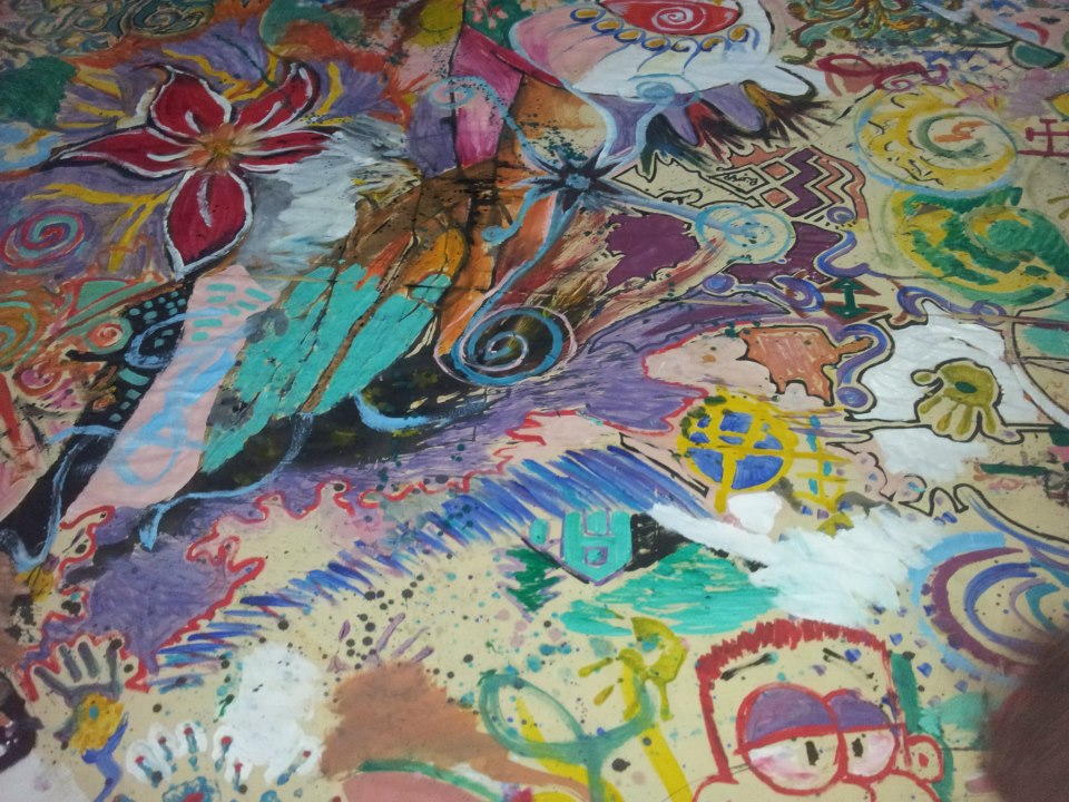 “Per un concerto di musica Jazz, il miglior modo di dipingere una scenografia è di farlo alla maniera della musica jazz. Una scenografia Jazz quindi, ma in che senso? E’ noto come una delle caratteristiche principali della musica Jazz sia l’improvvisazione di ogni singolo elemento dell’orchestra armonizzata nell’insieme della composizione. Molto spesso si decide di basare un tema musicale su un prestabilito giro di accordi o su un tempo e una ritmica precisi sui quali poi effettuare le variazioni o meglio le improvvisazioni. La scenografia che presento per il concerto della big band del conservatorio di Latina è stata pensata e composta con gli stessi principi. Ho radunato una piccola orchestra di pittori ai quali ho chiesto di improvvisare con la propria fantasia, dipingendo contemporaneamente sulla grande superficie. Ogni pittore ha improvvisato cosi il suo “pezzo” intervenendo però anche sulla pittura del suo compagno “d’orchestra” al fine di armonizzare il tutto. Il risultato è una grandissima composizione in cui simboli, colori, segni astratti e fumetti si intersecano fra loro senza mai “stonare”.” ( Filippo Saccà)