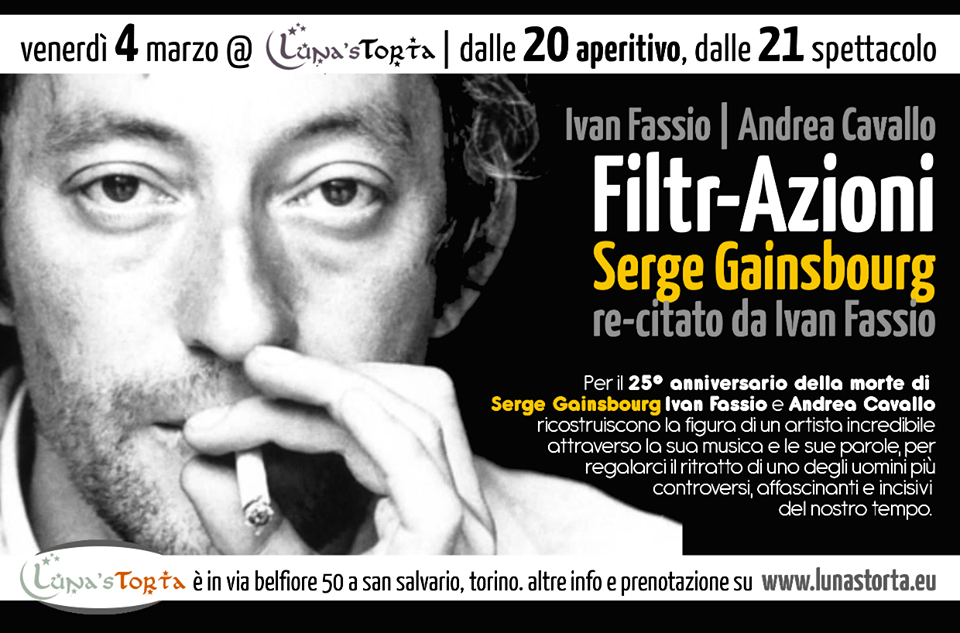 In occasione del 25° anniversario della morte di Serge Gainsbourg (2 marzo 1991), la Luna’s Torta presenta Andrea Cavallo e Ivan Fassio in FILTR-AZIONI , azione performativa poetico-musicale, un omaggio a un grande artista francese: pittore, cantante, scrittore, poeta, musicista.
