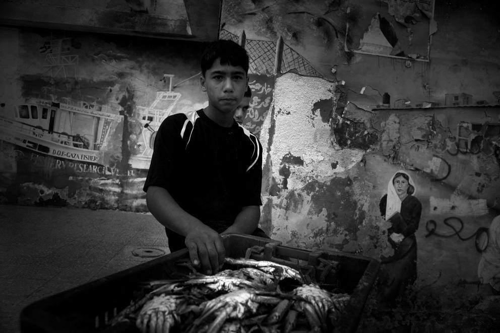 Ma quel mattino al porto, c’era una luce meravigliosa ; le nubi facevano risaltare il grigio dell’acqua, i colori sbiaditi delle barche. Le più grandi giacevano sul fianco, lo scafo sventrato dai colpi. Quelle più piccole erano state risparmiate, ma la maggior parte restava attraccata al molo per mancanza di benzina. Da lontano alcuni pescatori si affaccendavano ancora, riparando i motori, accomodando le reti; ci hanno accolti con grandi sorrisi: a Gaza se ne vedono pochi, di stranieri.