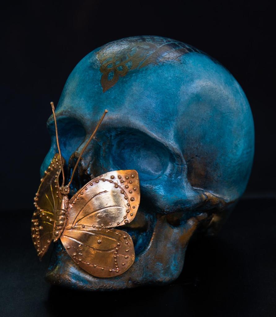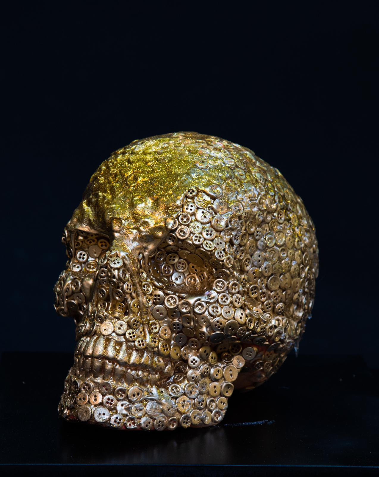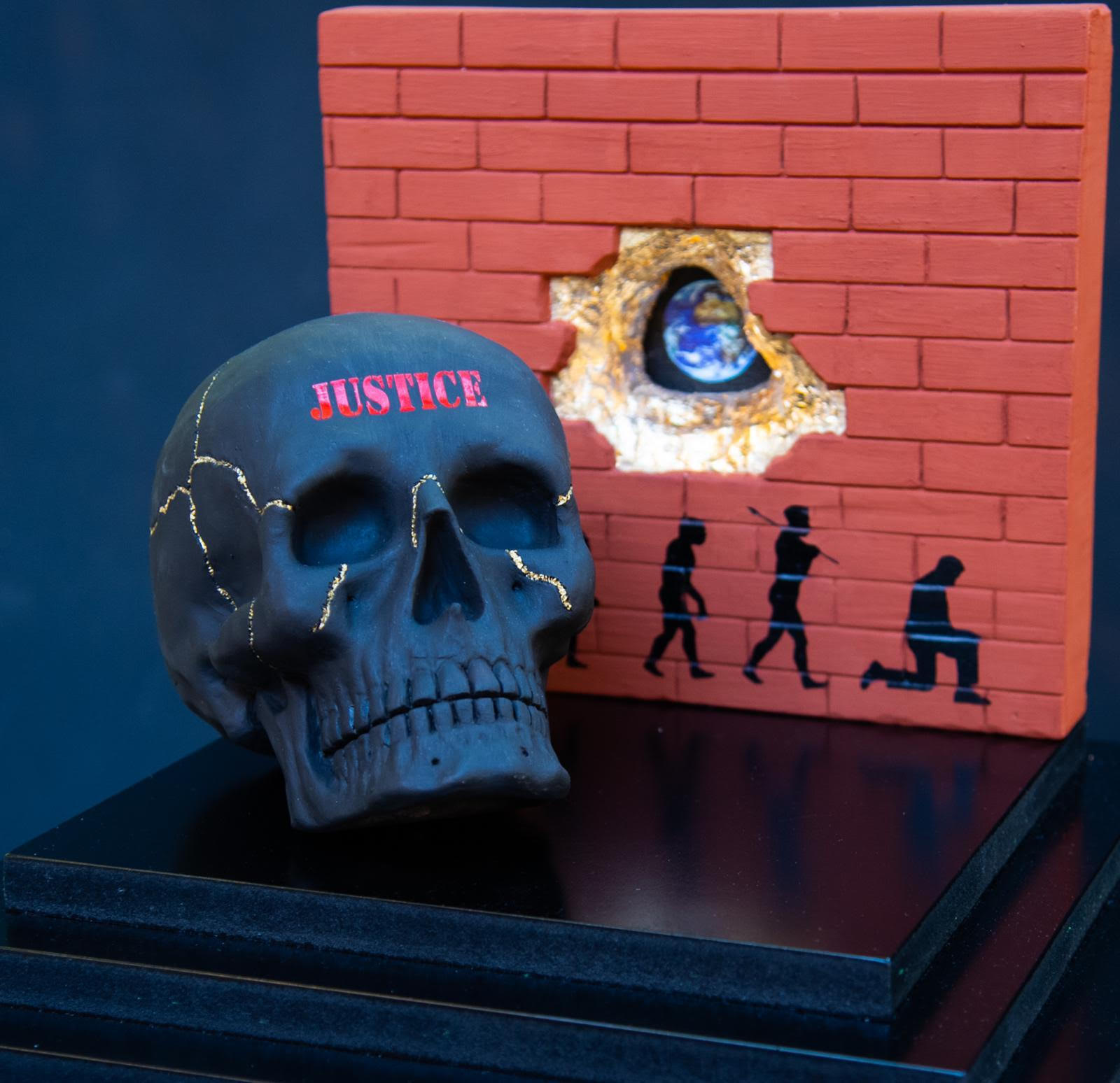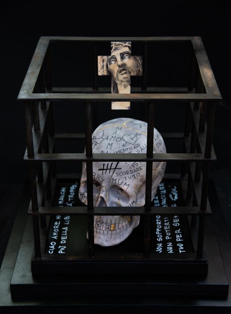 Un mondo che si fa piccolo quanto i confini della cella di un carcere in “Ego te absolvo” di Gabriele Donnini. Il teschio fulcro dell’opera è rinchiuso all’interno delle sbarre ed ha incise sulla sua superficie le parole, i disegni o i simboli che i detenuti hanno tracciato negli anni sulle pareti . Frasi che raccontano il dolore, ma anche l’orgoglio, la dignità, la paura, l’odio, il coraggio. Il carcere come un microcosmo , un “fuori mondo”, che è li ed esiste, un non luogo dove ogni essere umano è unico. E per raccontare questa unicità , la superficie del teschio è coperta da venature in oro , nessuna causale; si ispirano alla pratica giapponese del Kintsugi,l’arte delle preziose cicatrici che insegna ad accettare il danno, a non nascondere le ferite e le fratture, a renderle preziose.