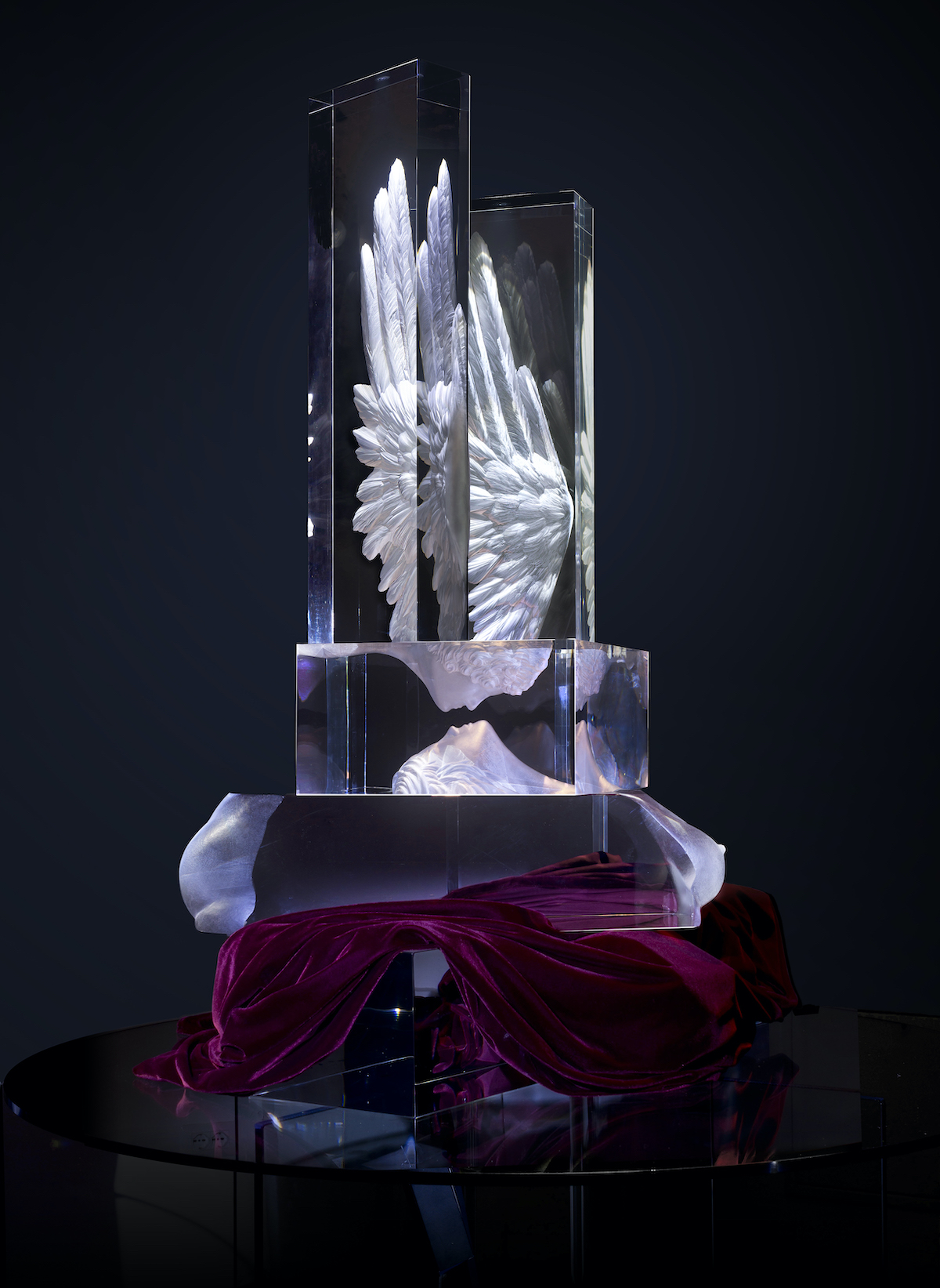 Il tributo a Canova da parte di Zaffina viene tra l’altro compiuto proprio in uno dei luoghi cari al Canova per la creazione delle sue opere, ovvero all’interno della fornace in cui modellava i bozzetti in creta. Nel corso degli ultimi due secoli sono stati molti gli scultori che si sono ispirati ad Amore e Psiche, offrendo differenti versioni del mito raccontato da Apuleio nelle Metamorfosi, ma nessuno di questi prima di Zaffina si era spinto al punto da creare un d’après dell’opera trasparente. Sì perché il gruppo scultoreo creato da Zaffina è costituito da dei blocchi di plexiglass sui quali l’artista è intervenuto scolpendo in negativo. Zaffina si è distinto negli ultimi trent’anni per un tipo di ricerca in cui ha saputo coniugare forme e modi della scultura classica con un approccio da archeologo del contemporaneo. Per anni lo scultore di origini calabresi ma romano d’adozione, ha scavato in pareti, muri, rocce facendo affiorare dalle crepe circuiti elettrici, computer e in generale elementi appartenenti alla civiltà tecnologica. [...] Il classico e il contemporaneo sono quindi due poli sui quali l’artista ha da sempre incentrato la sua attenzione e che possiamo ritrovare pienamente anche in questa scultura: classico è il tema del racconto, classica o meglio neoclassica anche la forma ricavata dalla scultura del Canova ma contemporanea è sia la tecnica esecutiva, sia il materiale con il quale è stata plasmata. [...]” Mentre Giuseppe Pansini nel testo in catalogo “Crisalide, d’Anima è corpo di Fiorenzo Zaffina”: “[...] Nell’opera di Fiorenzo Zaffina le figure non sono “blocchi” di pietra contrapposti ma diafani pensieri scavati, estratti dal profondo della sua, della nostra “Anima”. Sono frammenti di Sé, del Sé collettivo, che s’integrano nella promessa d’un bacio, d’un bacio d’Amore. Il bacio d’Amore che prende la finitezza d’ogni essere umano e la innalza, spiegando le sue ali, portandola sulle vette dell’eterna esistenza dei nostri multi-versi. [...]”