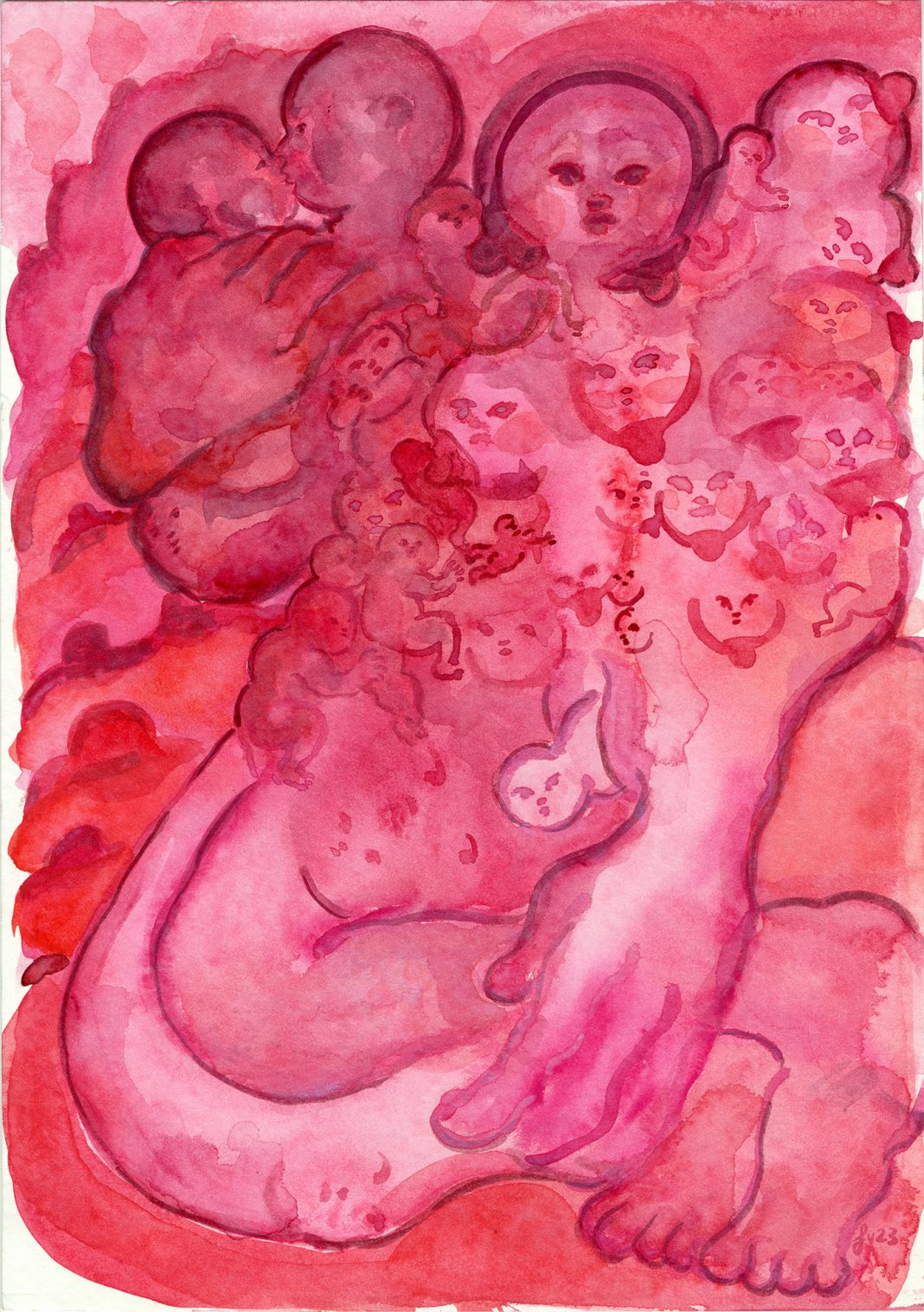 Le figure disegnate dall’artista sono creature mutanti che, pur conservando i tratti del genere femminile sotto l’aspetto sessuale, sono permeabili a una fluttuazione metamorfica che abbraccia una concezione espansa di essere umano. Così facendo, Flaminia Veronesi dichiara il suo intento di ripensare l’idea di “madre” e di andare oltre lo stereotipo che relega questa esperienza alla sola sfera femminile.