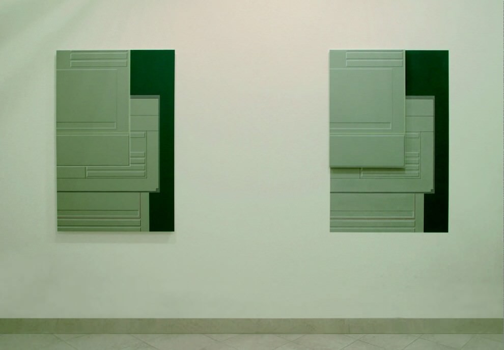 Nello spazio dell’Ex Falegnameria, l’artista presenta un’installazione che invade interamente lo spazio delle pareti attraverso un dialogo serrato tra il muro dipinto e la tela ad esso sovrapposta. Sul wall drawings di fondo fluttuano brani di una stessa immagine che si ripete attraverso sezioni differenti senza mai apparire per intero. La visione simultanea delle parti dell’immagine slitta continuo tra i supporti, attraverso parziali svelamenti, il tutto congelato nella dimensione fisica della pittura. La mobilità dell’icona, una schermata windows, sembra richiamare la facilità, all’interno del video del computer, con cui il mouse permette di saltare da una finestra all’altra, aprendo e chiudendo porzioni di spazio virtuali, spostandole sul lato, in alto e in basso, proiettando, contemporaneamente, più luoghi “agibili” da un medesimo corpo.