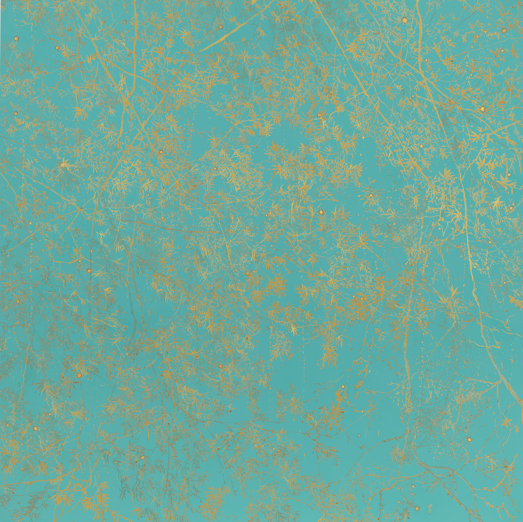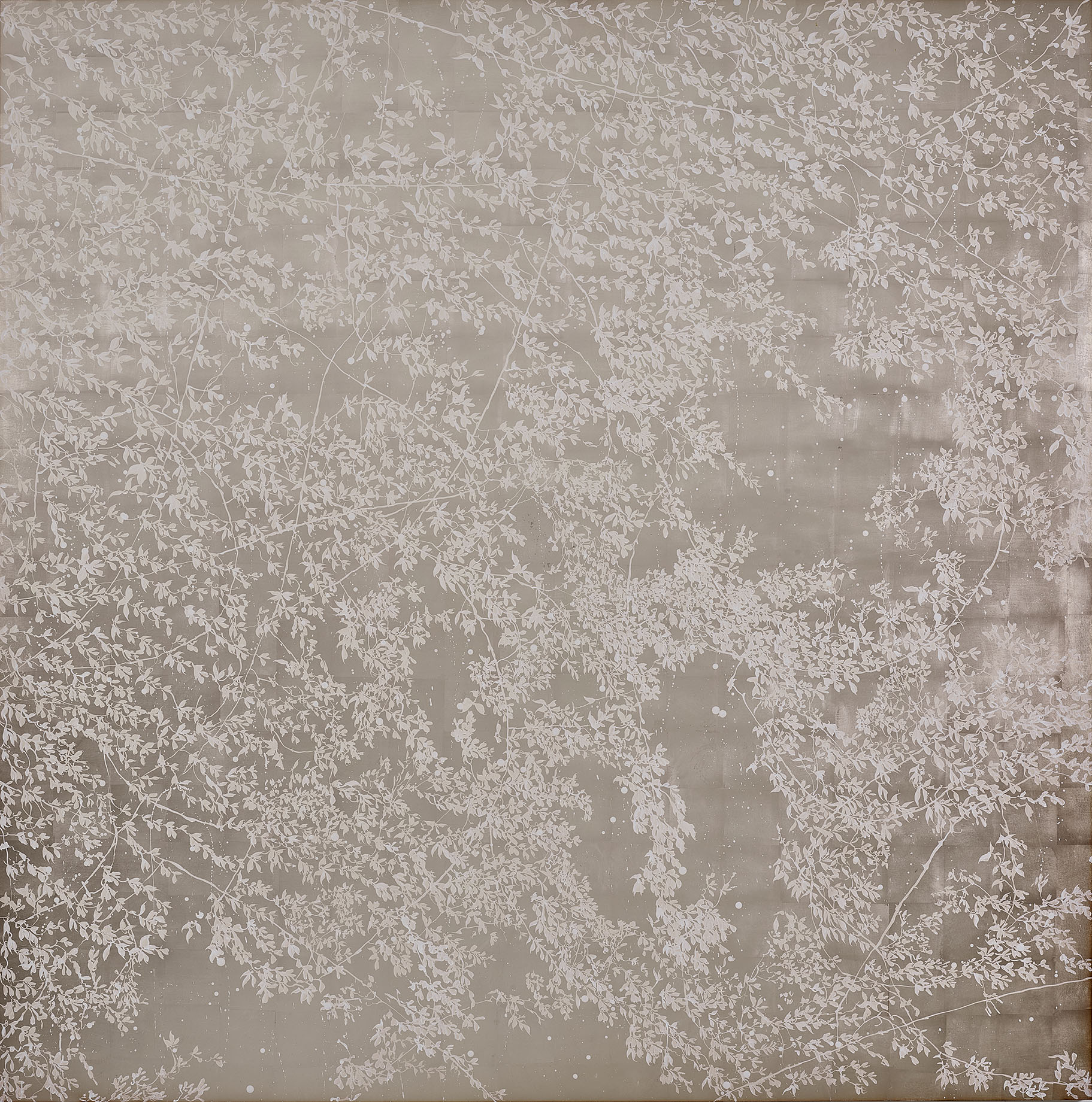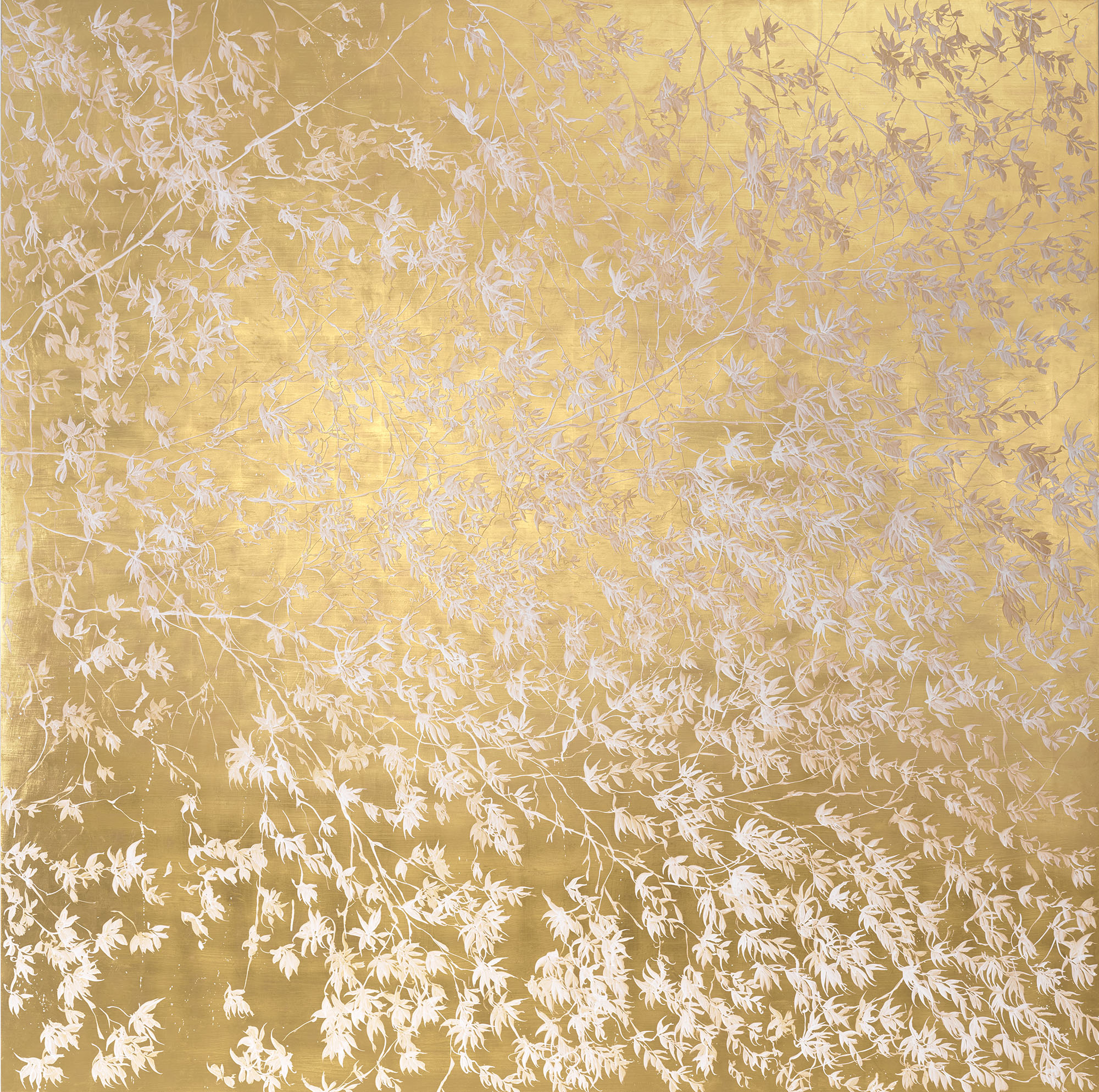 Alla base del lavoro di Sue Arrowsmith v’è il tema della natura. La mostra è un poetico racconto in cui fiori e fogliami si spiegano tremolanti nella luce attraverso un’alchimia di materiali. L’uso di pregiati elementi come foglie d’oro e altri metalli preziosi sovrapposti, sui quali il colore è diluito, riflette la luce evocando una sensazione eterea. È l’artista stessa ad affermare di essere interessata “a esplorare i temi della luce, del gesto e dello spazio attraverso l'energia e il ritmo della creazione di segni".